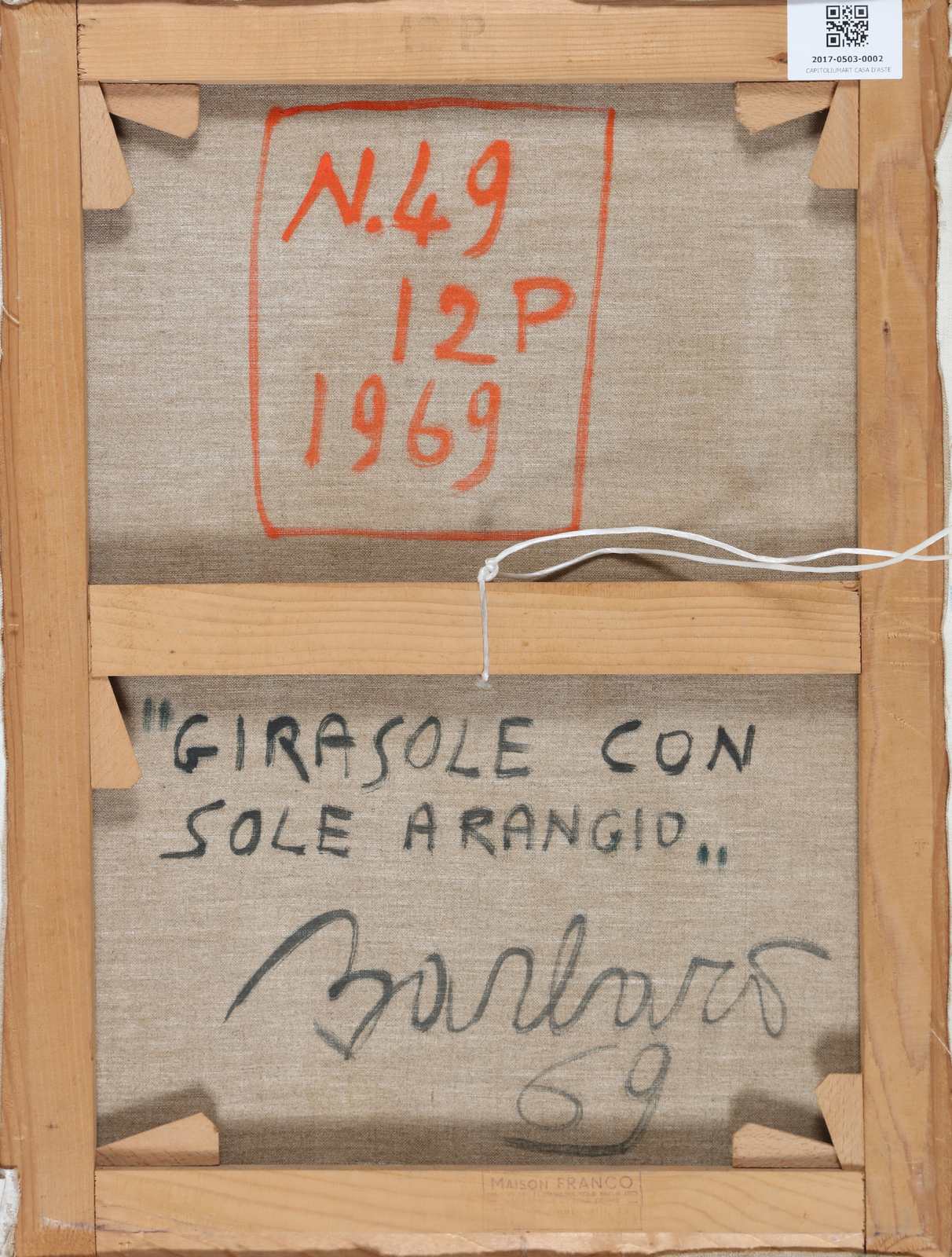 BARBARO SAVERIO (n. 1924) Girasole con sole arancio. . 1969. Olio su tela . Cm 46,00 x 61,00. Firma e anno in alto a destra. Al retro titolo, firma e anno. Timbro Maison Franco, Nizza.