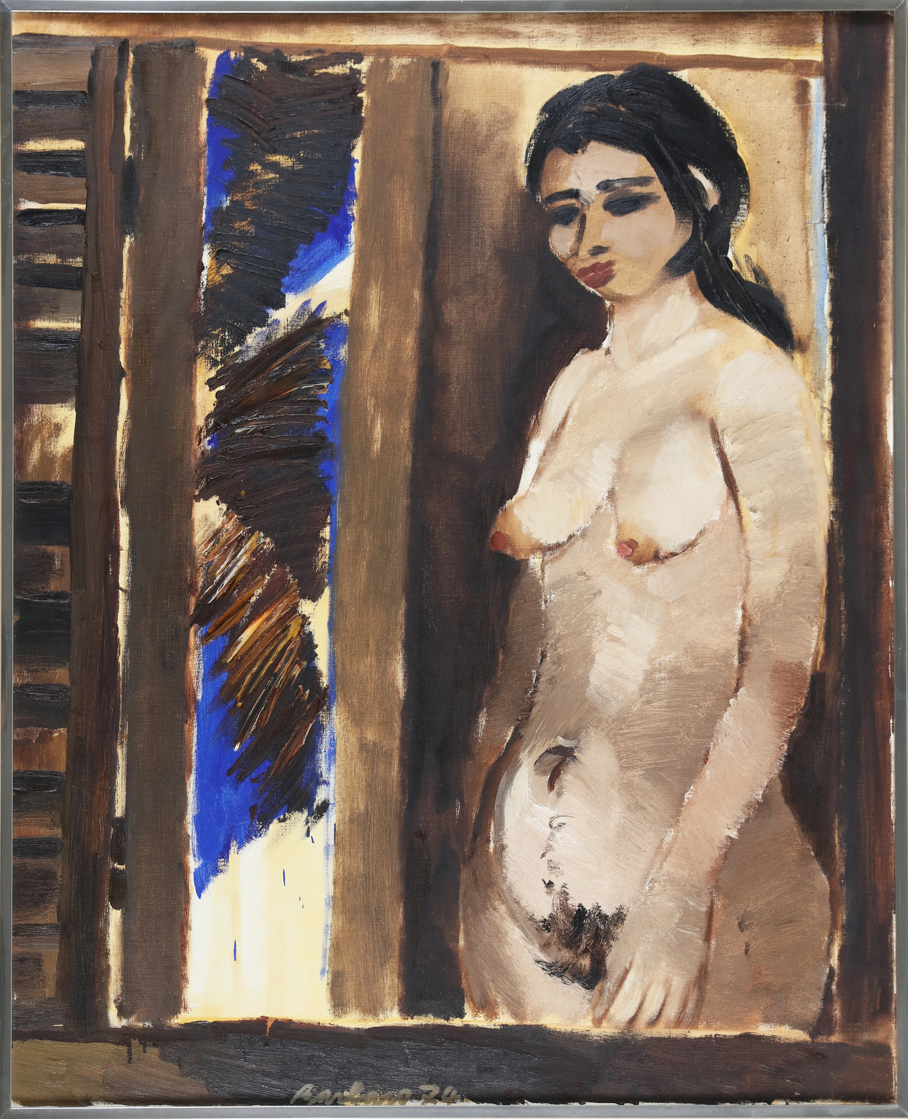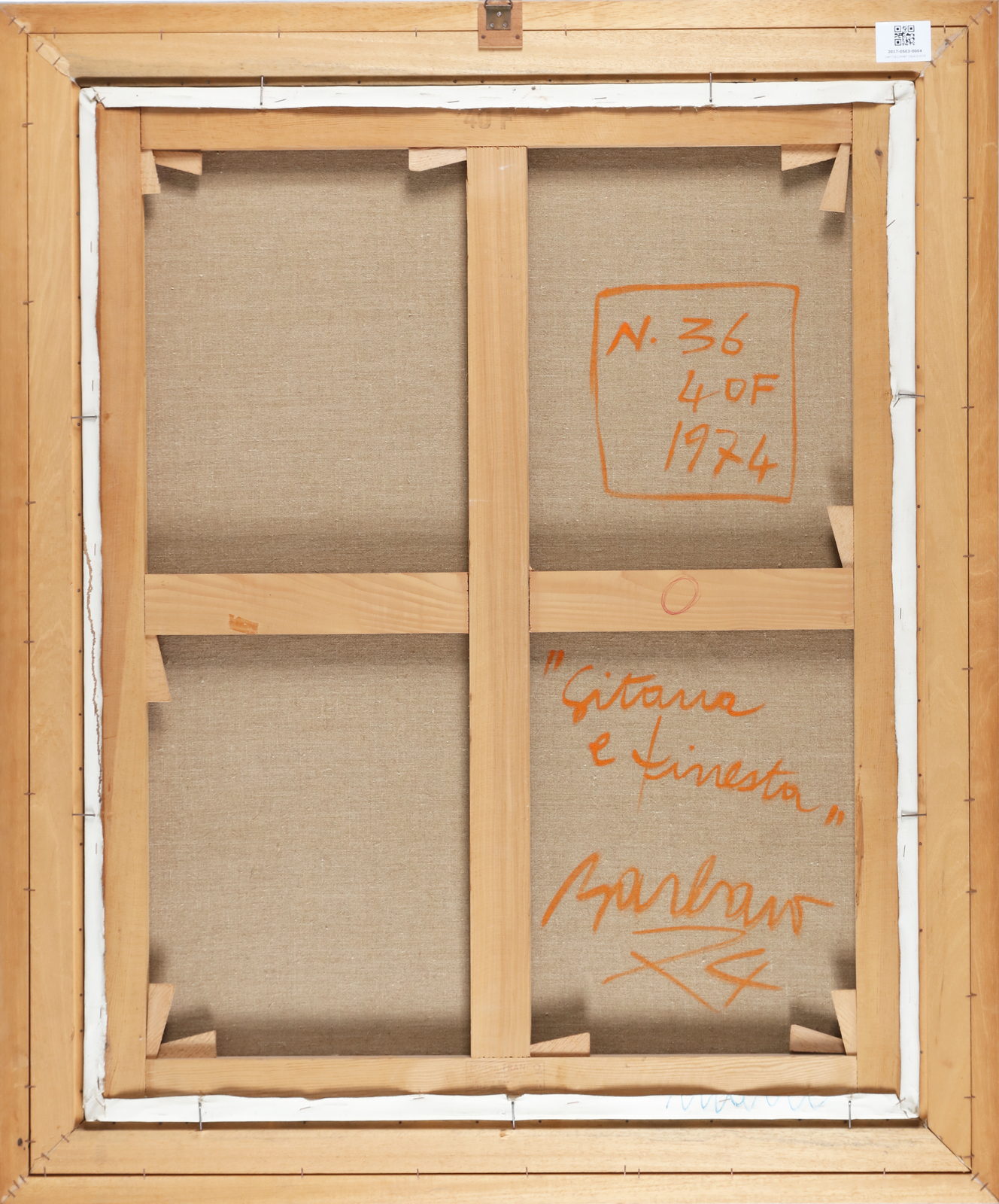 BARBARO SAVERIO (n. 1924) Gitana e finestra. 1974. Olio su tela . Cm 81,00 x 100,00. Firma e anno in basso al centro. Al retro titolo, firma e anno. Timbro a cura di Maison Franco, Nizza. . Cornice presente