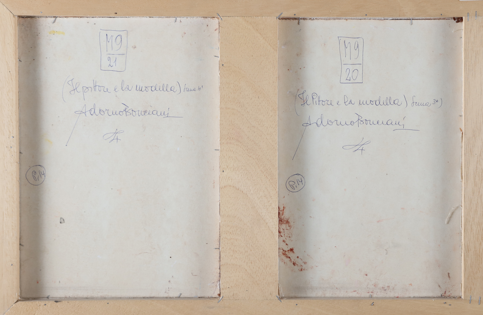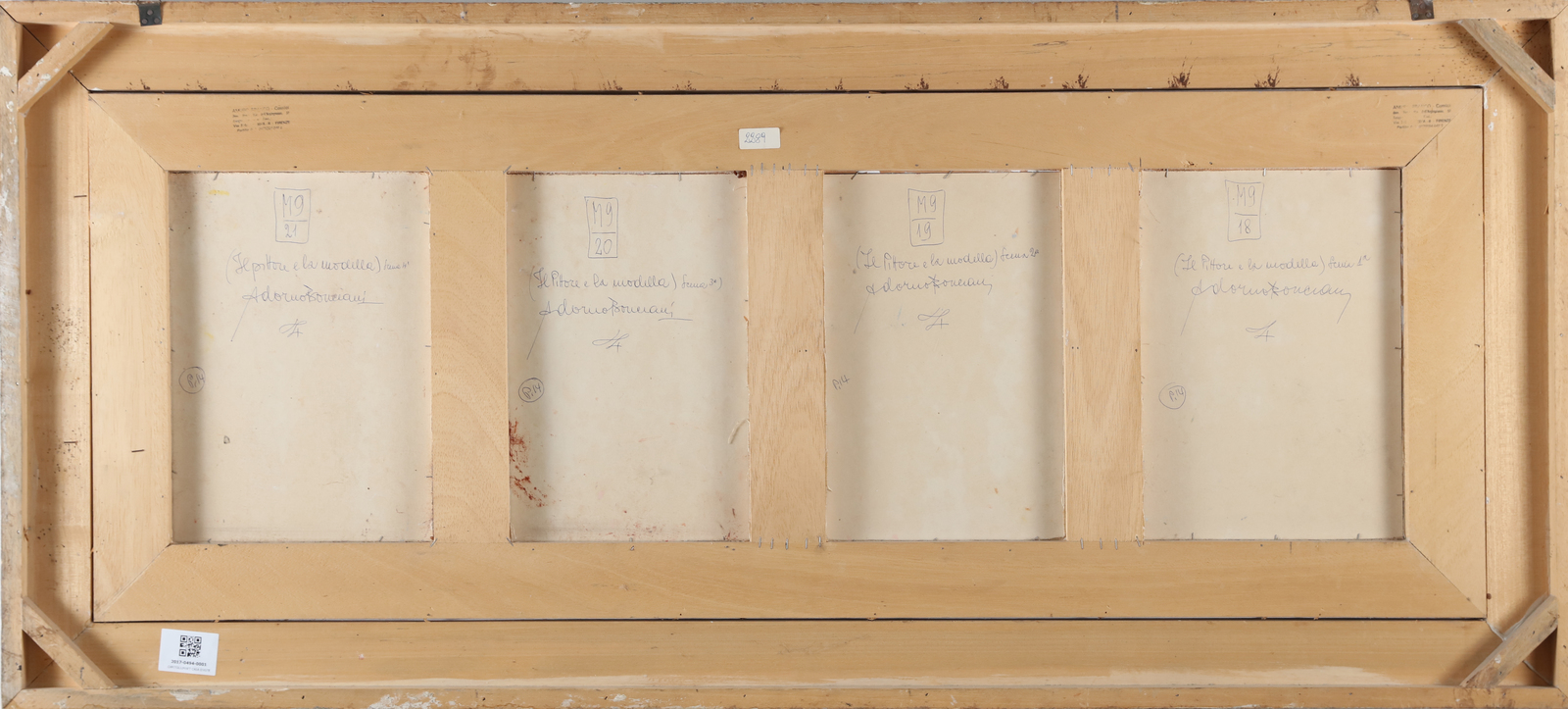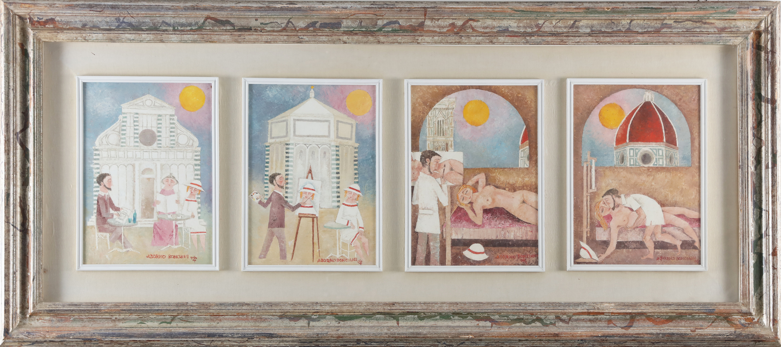 BONCIANI ADORNO (n. 1920) Il pittore e la modella. . Olio su tavola. Cm 130,00 x 48,00. L'opera è composta da 4 pannelli, misura 35x24 cm, firma in basso a destra, al retro titolo e firma e timbro Renzo Spagnoli Arte, Firenze. Certificato di autenticità Renzo Spagnoli Arte, Firenze. . Cornice presente