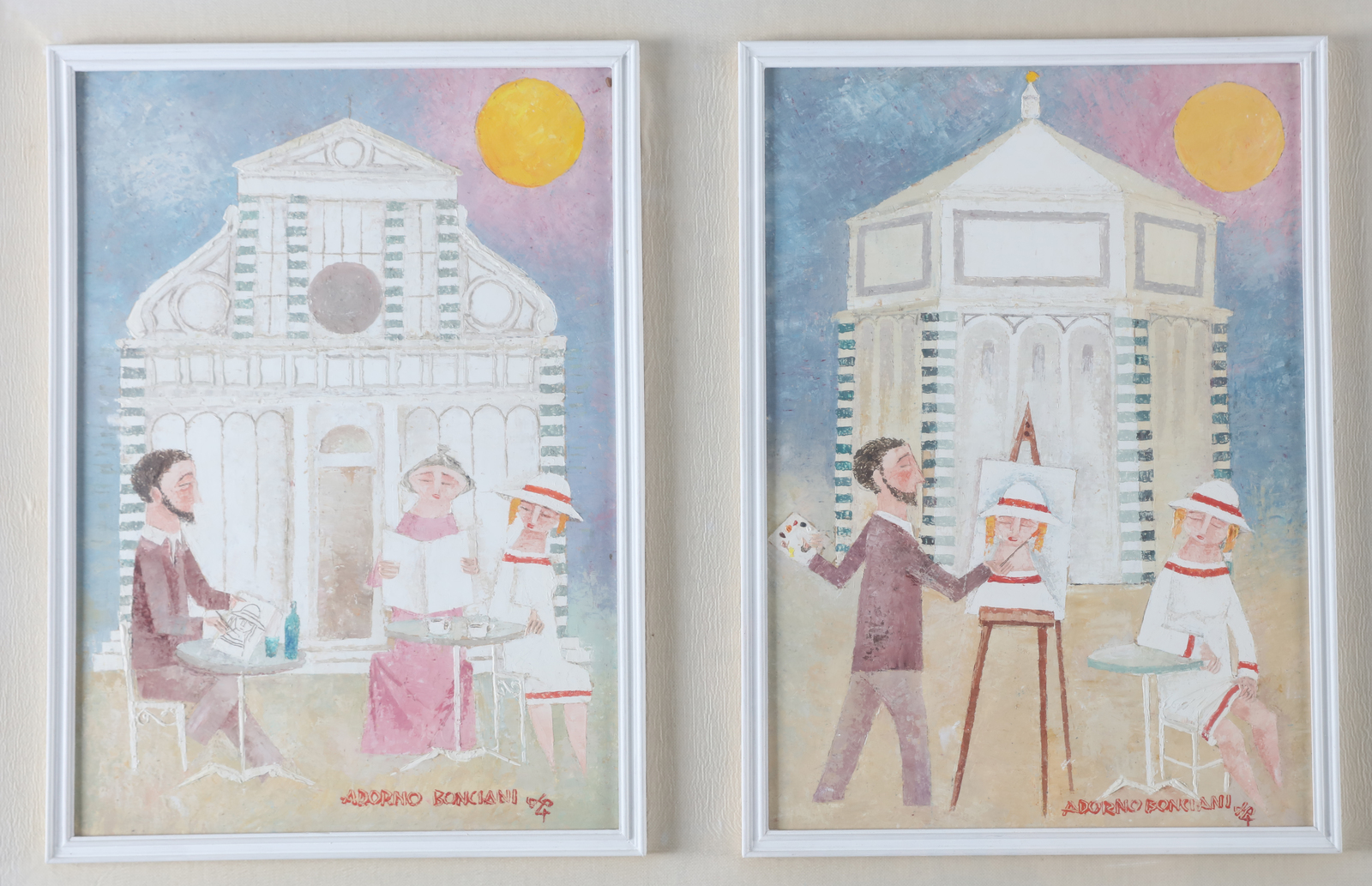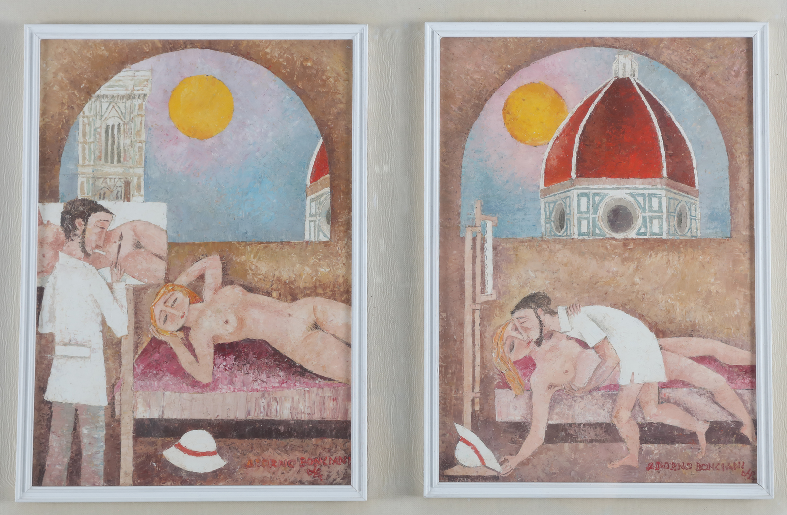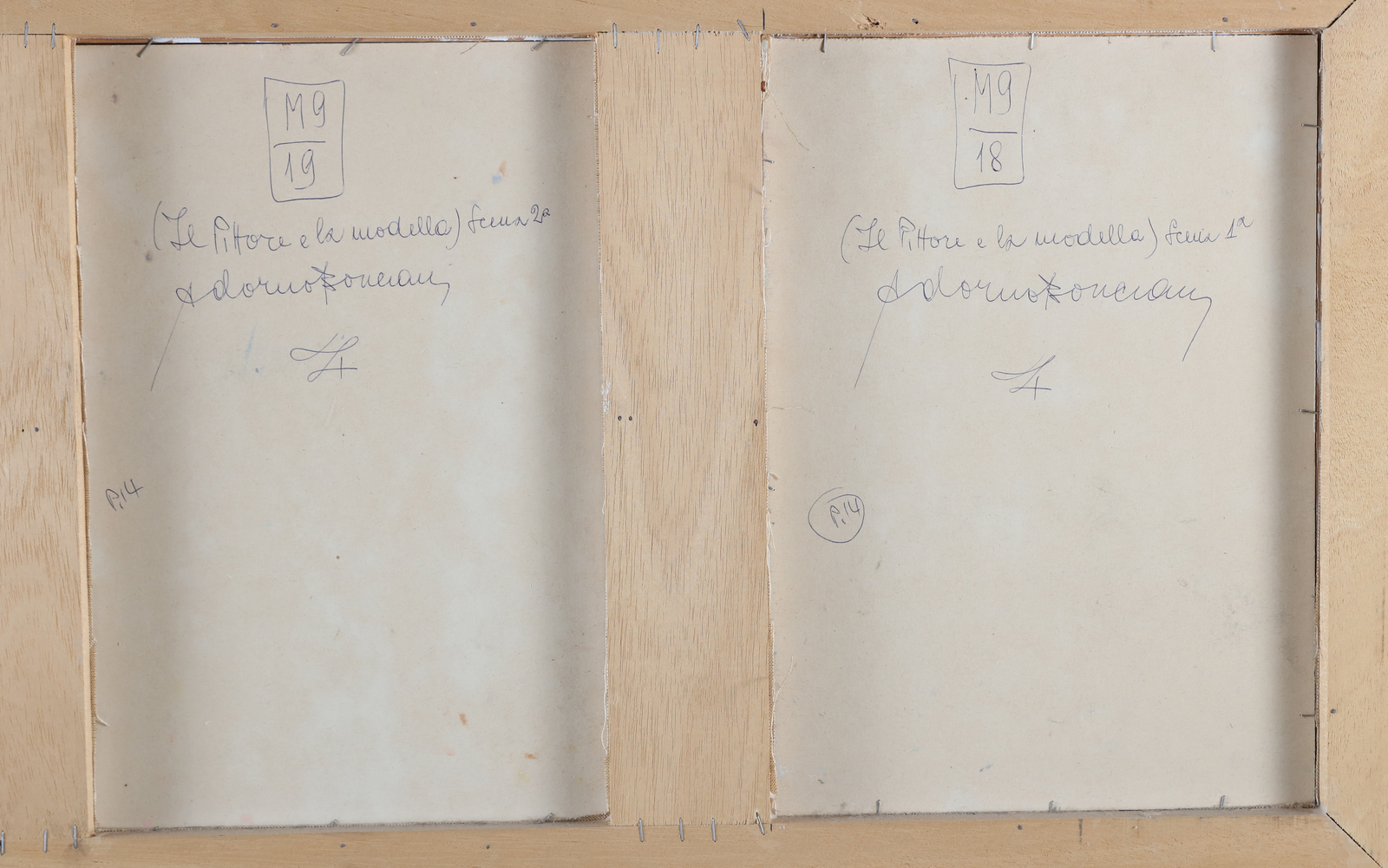 BONCIANI ADORNO (n. 1920) Il pittore e la modella. . Olio su tavola. Cm 130,00 x 48,00. L'opera è composta da 4 pannelli, misura 35x24 cm, firma in basso a destra, al retro titolo e firma e timbro Renzo Spagnoli Arte, Firenze. Certificato di autenticità Renzo Spagnoli Arte, Firenze. . Cornice presente