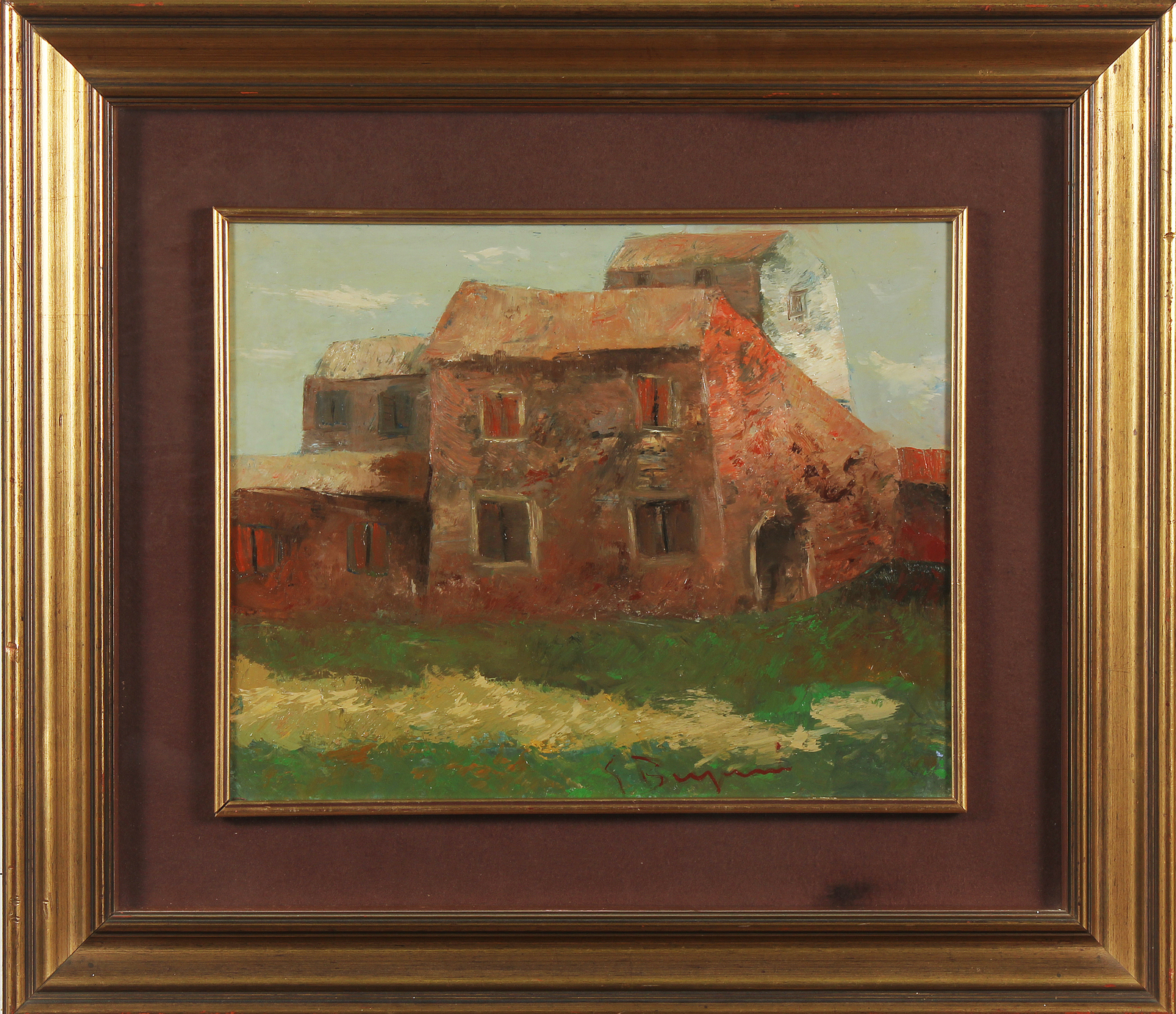 BERGOMI GIACOMO (1923 - 2003) Cascinale. Olio su tavola. Cm 50,00 x 40,00. Firma in basso a destra. Cornice presente