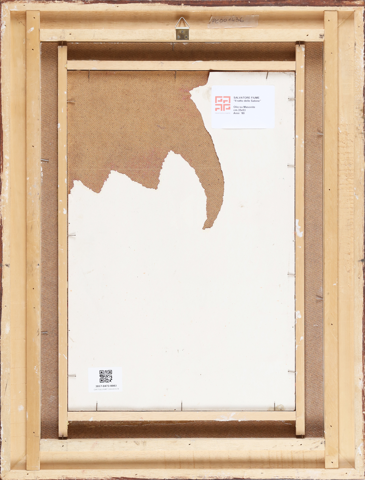 FIUME SALVATORE (1915 - 1997) Donna rapita. 1980. Olio su masonite. Cm 36,00 x 54,00. Firma in basso a sinistra. Al retro cartiglio descrittivo della galleria Proposte d'arte, Legnano. Pubblicazione: Catalogo Generale Fiume Salvatore, Mondadori, tav. 220. Cornice presente