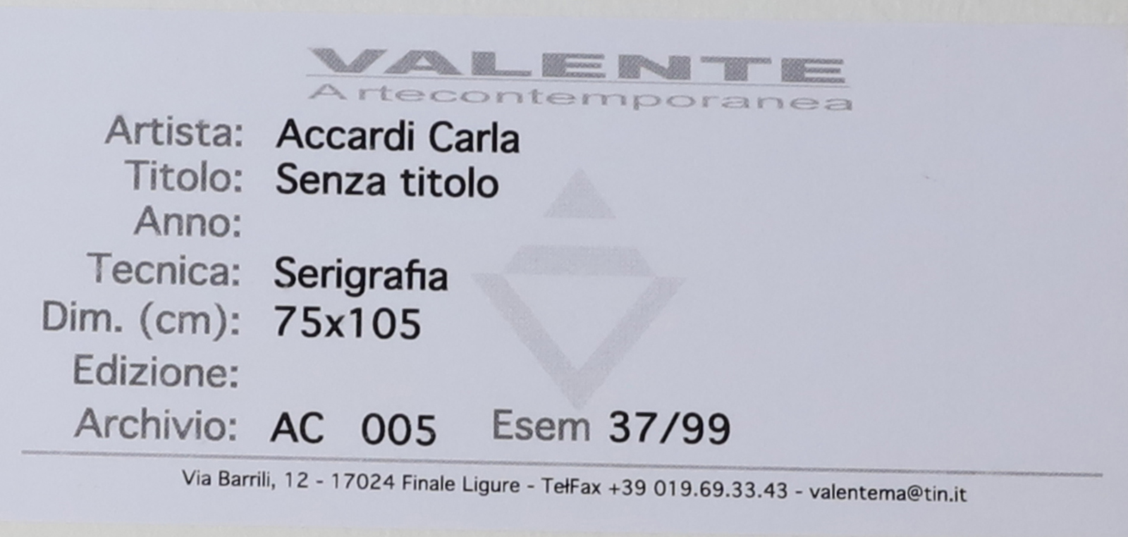 ACCARDI CARLA (1924 - 2014) Senza titolo. Serigrafia. Cm 105,00 x 75,00. 37/99. Dimensioni lastra: cm 51x76. Timbro a secco - Stamperie Carafiser, Roma - in basso a sinistra. Firma e tiratura in basso a matita.