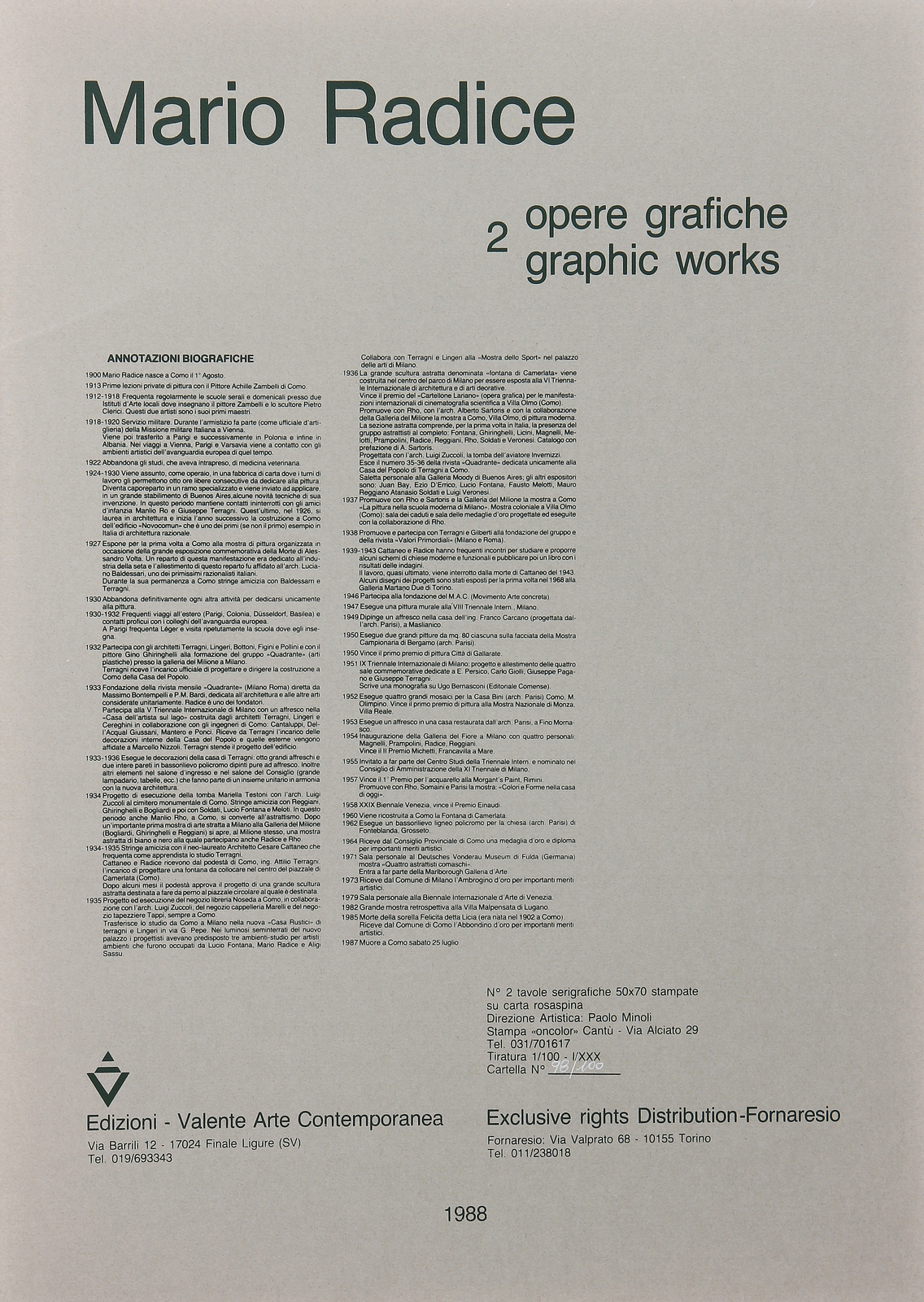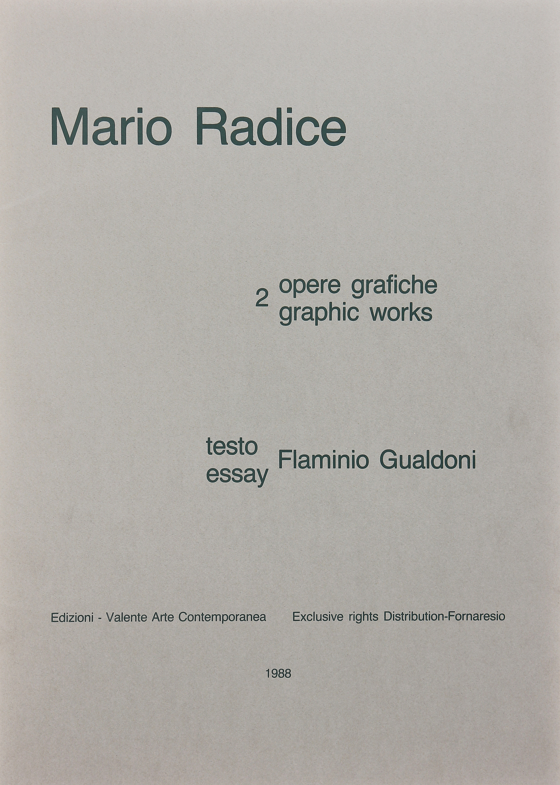 RADICE MARIO (1898 - 1987) Mauro Radice (cartella). 1988. Serigrafia. Cm 50,00 x 70,00. Cartella completa contenente n.2 serigrafie firmate e numerate dall'autore a matita. Tiratura: 100 + XXX. Edizioni Valente Arte Contemporanea, con testi di Flaminio Gualdoni. Confezione originale numerata. Esemplare: 98