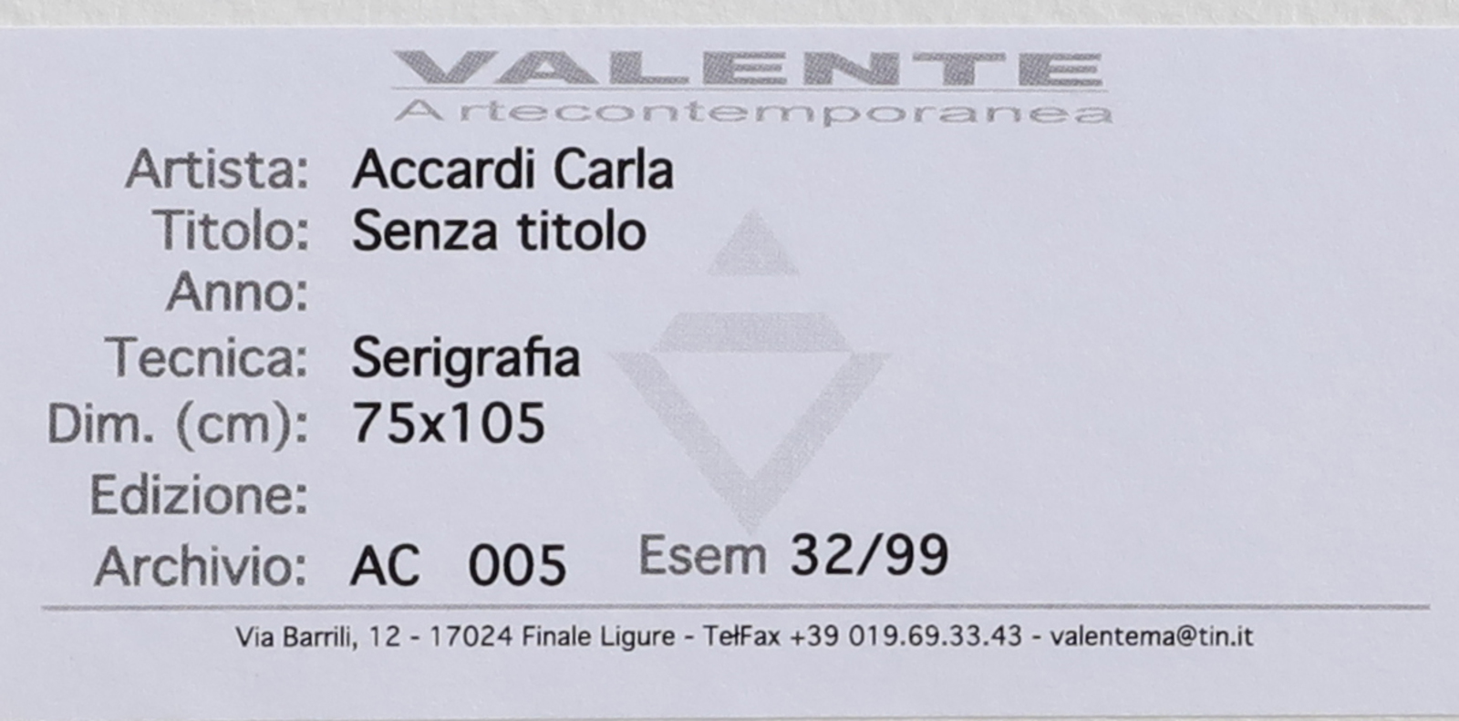 ACCARDI CARLA (1924 - 2014) Senza titolo. Serigrafia. Cm 105,00 x 75,00. 32/99. Dimensioni lastra: cm 51x76. Timbro a secco - Stamperie Carafiser, Roma - in basso a sinistra. Firma e tiratura in basso a matita.
