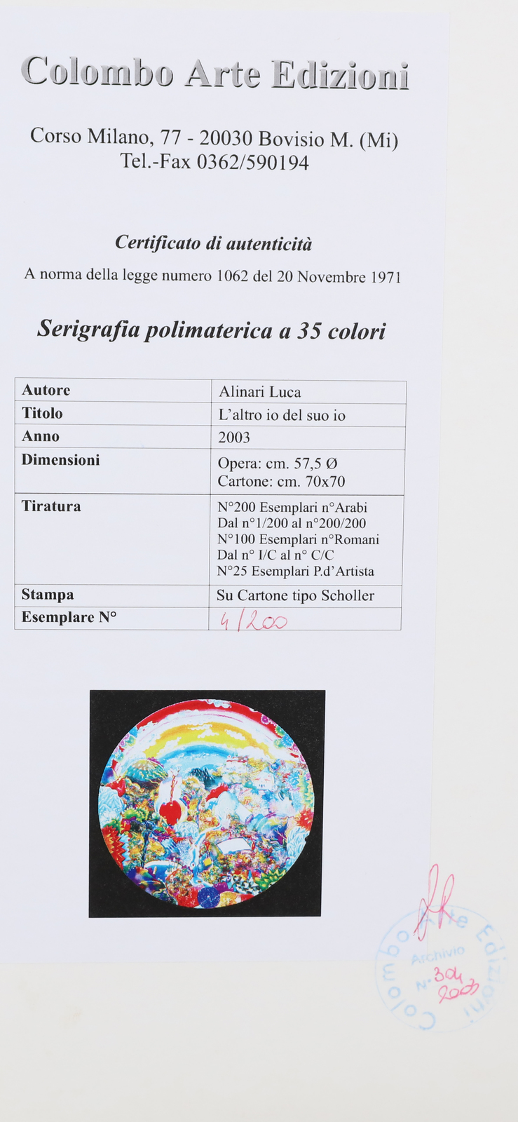 ARTISTI VARI Lotto composto da due grafiche. . Grafica. Cm 70,00 x 70,00. Donzelli, Macedonia tropicale, litografia, LX/CL, tiratura e firma a matita in basso, con cornice. Alinari, L'altro io del suo io, serigrafia polimaterica 35 colori, 70x70, 4/100, tiratura e firma in basso. Al retro cartiglio descrittivo con timbro Colombo Arte, Bovisio Milanese ( MI).