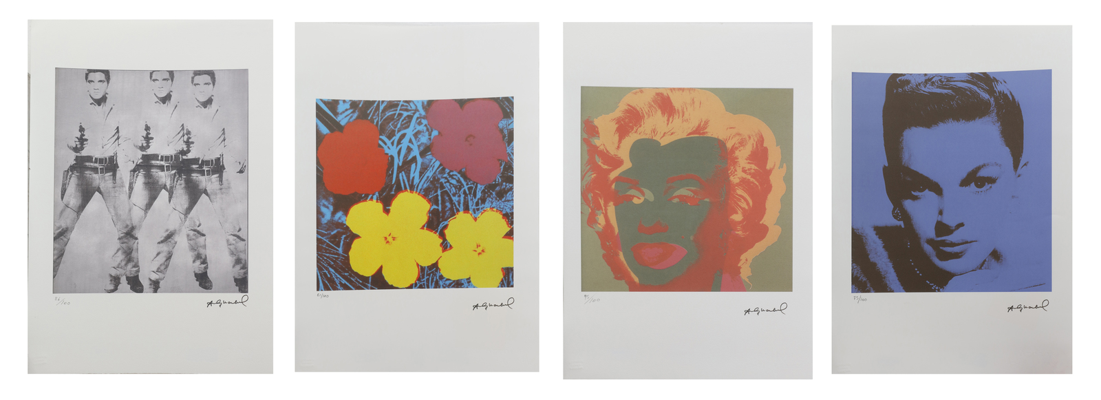 WARHOL ANDY (1928 - 1987) Lotto composto da n. 4 grafiche. Litografia. Cm 38,00 x 56,50. 86/100.51/100. 95/100. 75/100. Tutte le grafiche riportano tiratura a matita in basso a sinistra, firma a stampa in basso a destra. Al retro timbro Art Gallery, New York e timbro Leo Castelli, New York.