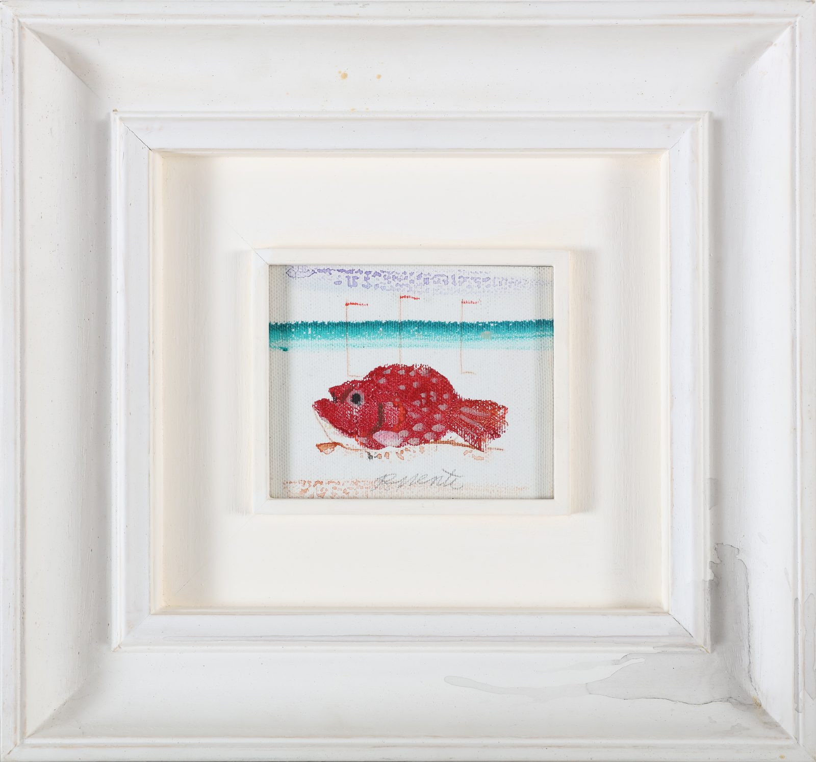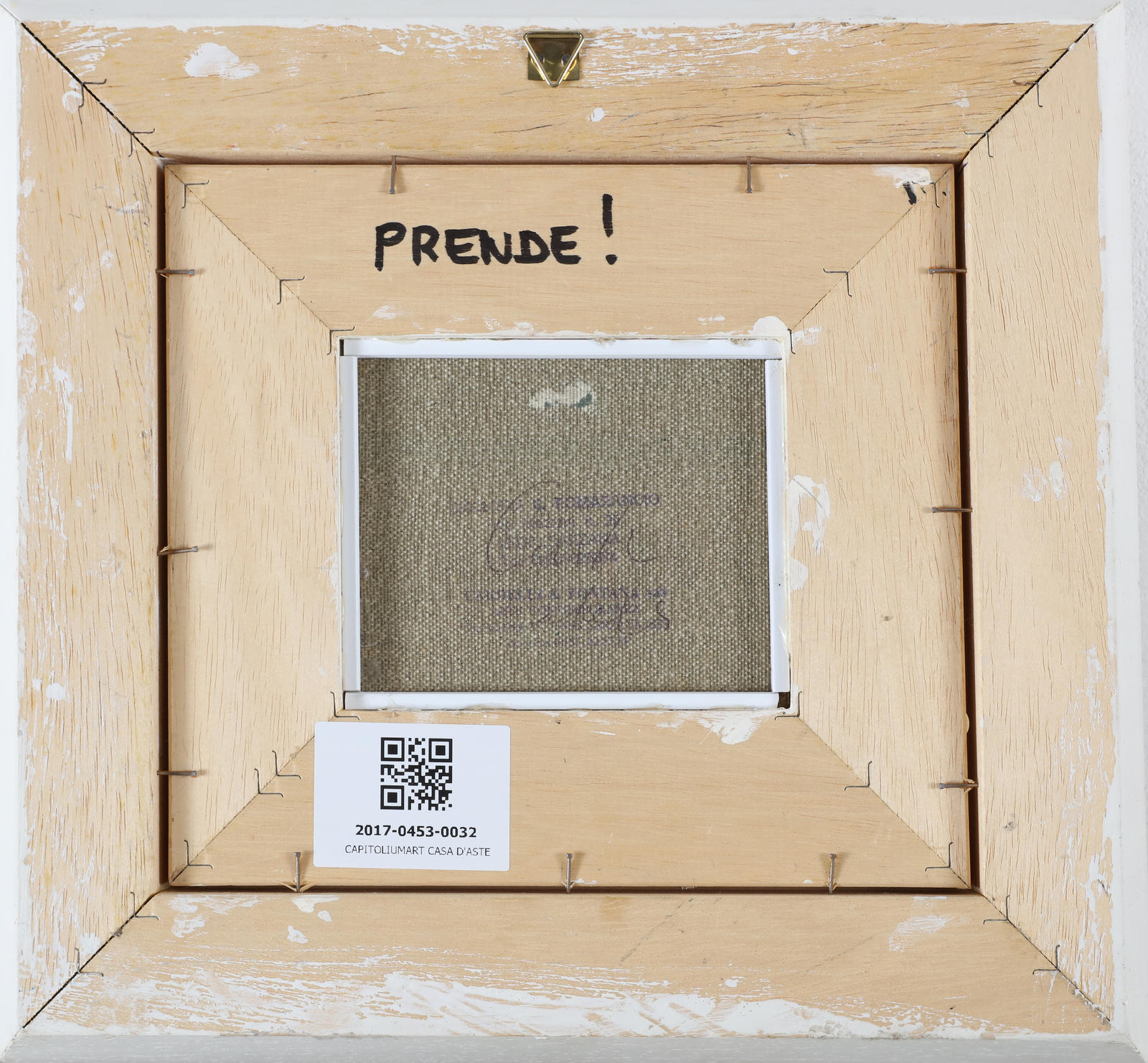 POSSENTI ANTONIO (n. 1933) Prende!. Tecnica mista su tela. Cm 10,00 x 12,00. Firma in basso al centro. Al retro titolo. . Cornice presente
