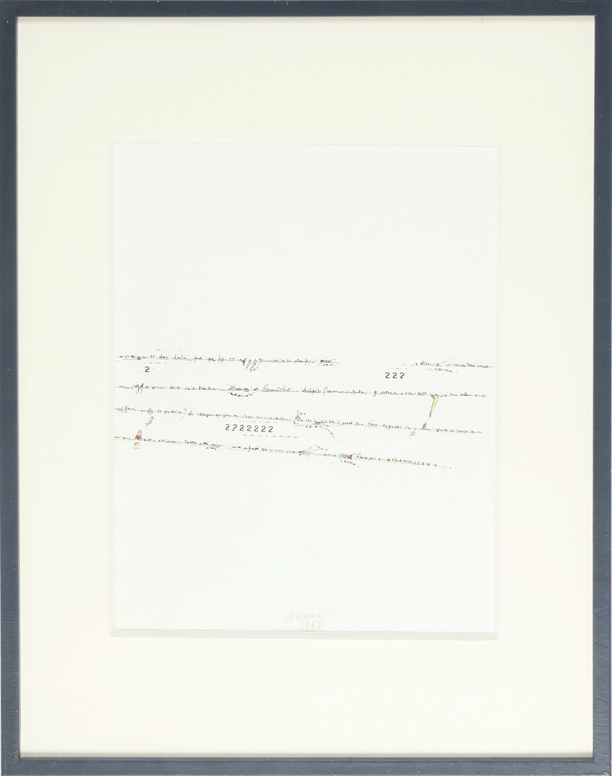 ACCAME VINCENZO (n. 1932) Senza titolo. 1987. Tecnica mista su carta. Cm 20,00 x 26,00. Firma e anno in basso al centro a matita. Autentica dell'artista su fotografia. Cornice presente