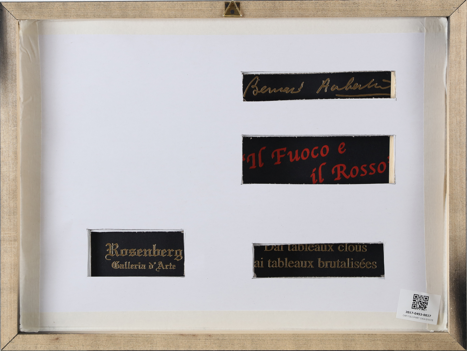 AUBERTIN BERNARD (1934 - 2015) Livre Brulè Rosenberg. . 2010. Fiammiferi bruciati su catalogo. Cm 44,00 x 30,00. Firma in basso a destra. Opera archiviata presso l'Archivio generale delle opere di Bernard Aubertin, Galleria Rosenberg, Milano, come da documentazione fotografica allegata all'opera riportante il relativo numero di inventario. Cornice presente
