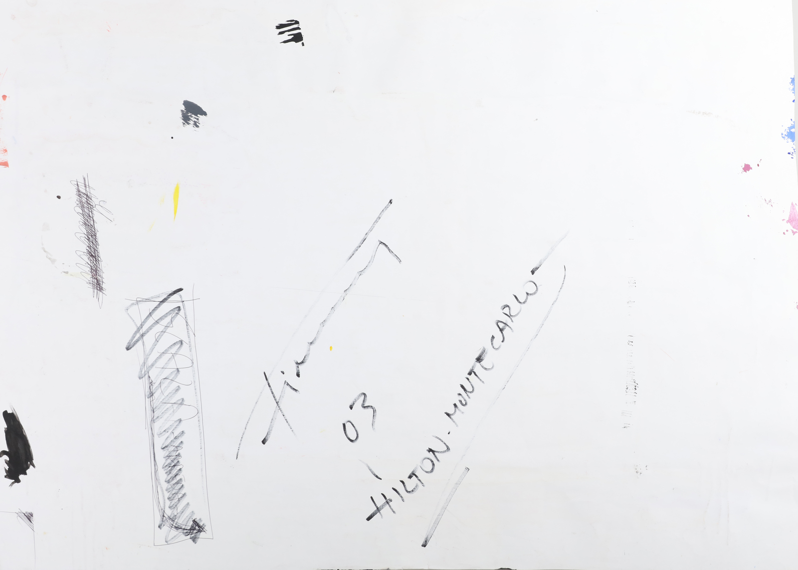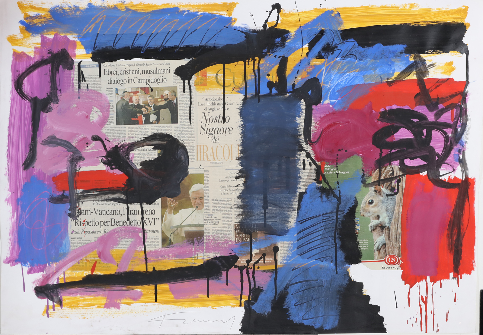 FIERAMOSCA JAMES (n. 1949) Senza titolo. 2003. Tecnica mista e collage su carta. Cm 100,00 x 70,00. Firma in basso al centro. Al retro firma e anno. La carta presenta un piccolo strappo.
