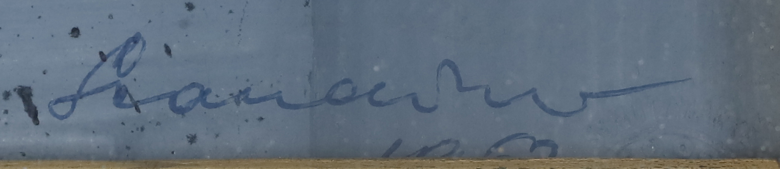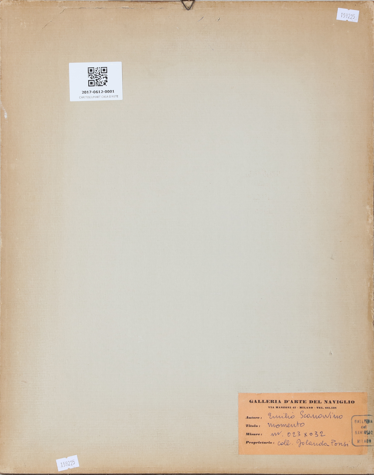 SCANAVINO EMILIO (1922 - 1986) Momento. 1962. Tecnica mista su cartoncino. Cm 23,00 x 32,00. Firma e anno in basso a destra. Al retro cartiglio e timbro della Galleria d'Arte Il Naviglio, Milano. Provenienza: Collezione Jolanda Ponsi. Cornice presente