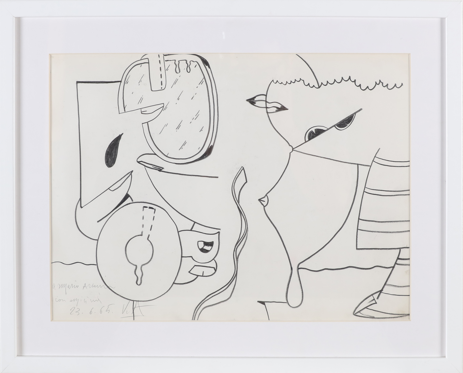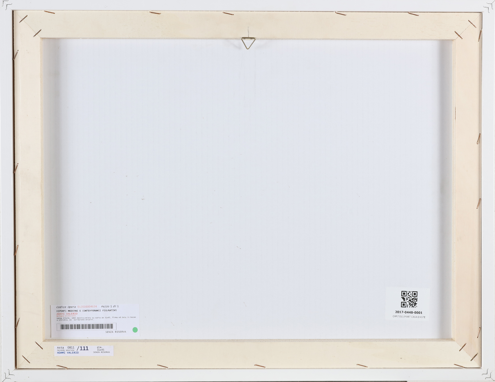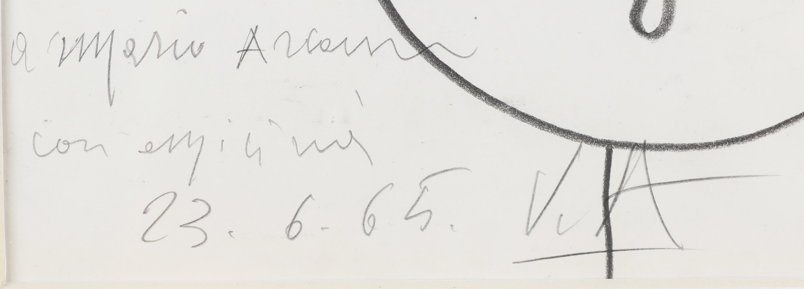 ADAMI VALERIO (n. 1935) Senza titolo. . 1965. Tecnica mista su carta. Cm 45,00 x 31,00. Dedica, firma e anno a matita in basso a sinistra. Pubblicazione: Il quaderno di Mario Arcaini, stampatore a Milano negli anni '60 - '70. Il presente catalogo riproduce interamente un quaderno di Mario Arcaini, dove molti artisti, tra il 1965 e il 1974, hanno lasciato una propria testimonianza, dedicando all'amico stampatore un disegno accompagnandolo spesso con parole di stima e di amicizia. Cornice presente
