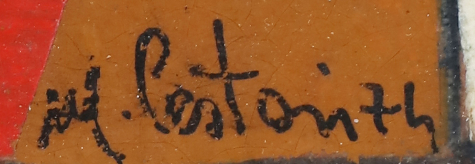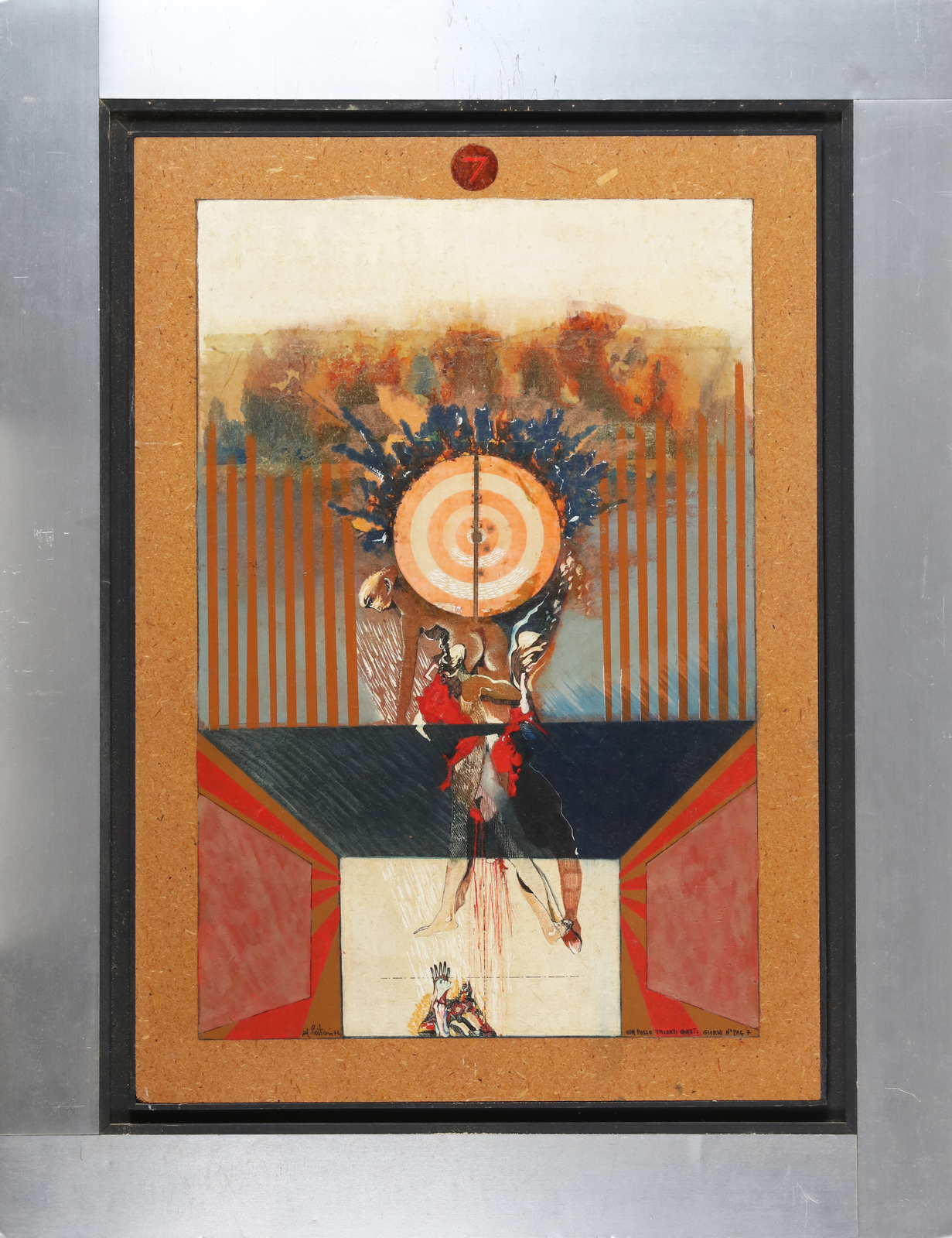 CESTARI MARIO (n. 1943) Non posso tacerti questi giorni. N. Pag. 7. . Tecnica mista e collage su tavola. Cm 50,00 x 70,00. Firma e anno in basso a sinistra. Titolo in basso a destra. Al retro cartiglio descrittivo e timbro Galleria d'arte Torre, Mestre, VE. Al retro titolo, firma e timbro dell'artista. . Cornice presente