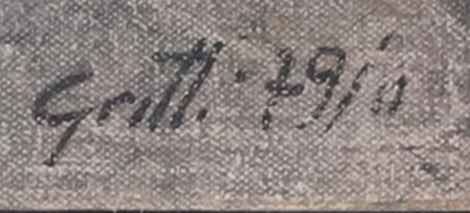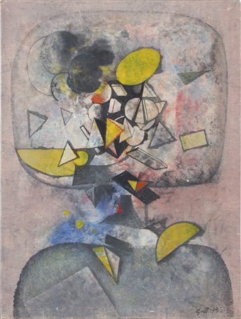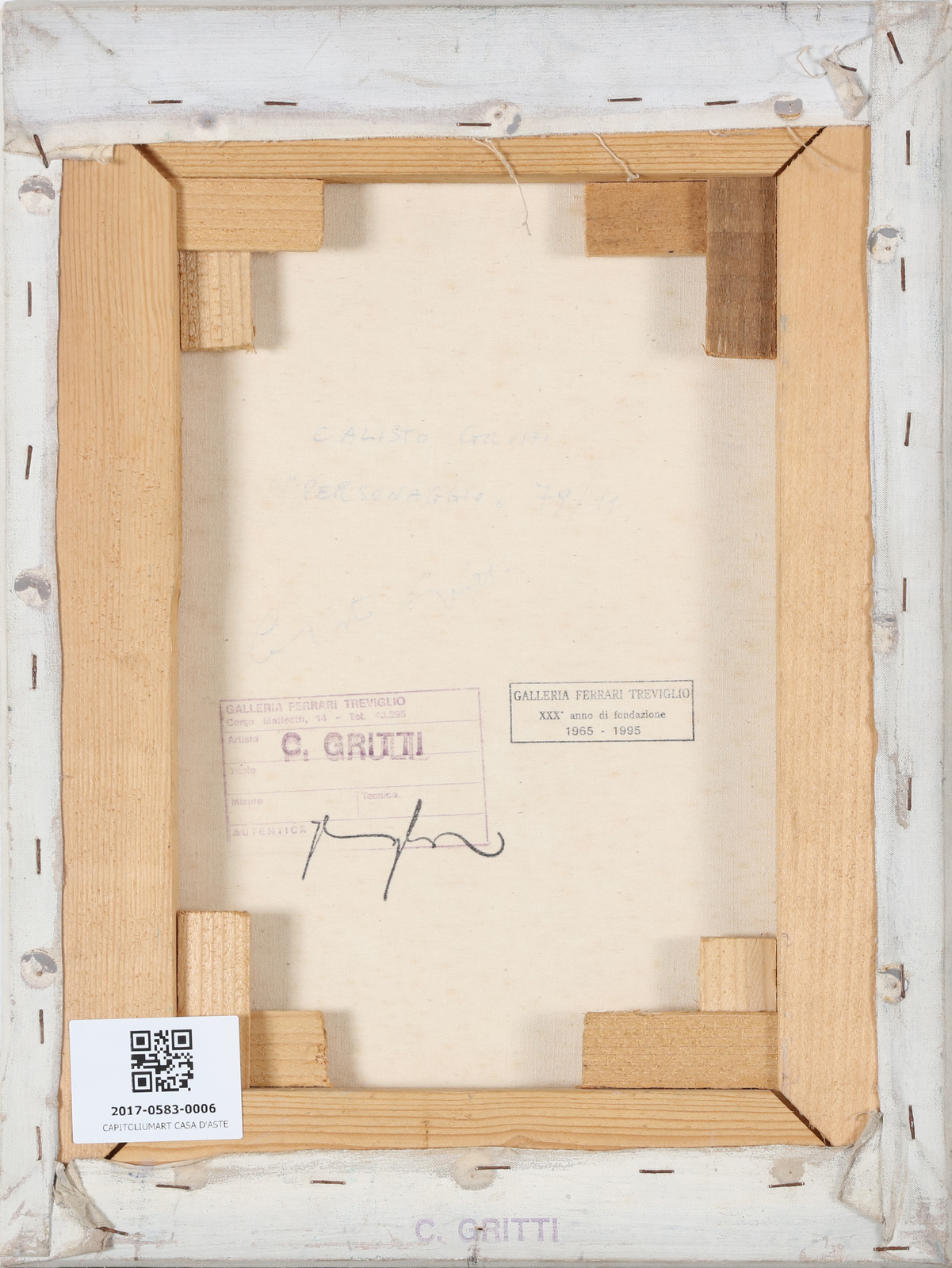 GRITTI CALLISTO (n. 1937) Personaggio. Tecnica mista su tela. Cm 30,00 x 40,00. Firma e anno in basso a destra. Al retro titolo, firma, anno e timbro Galleria Ferrari, Treviglio.