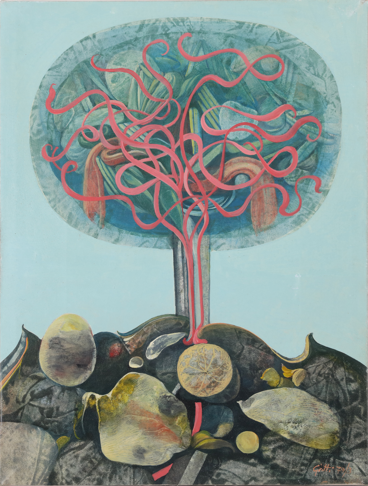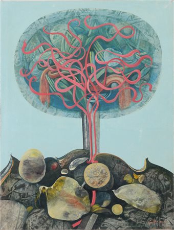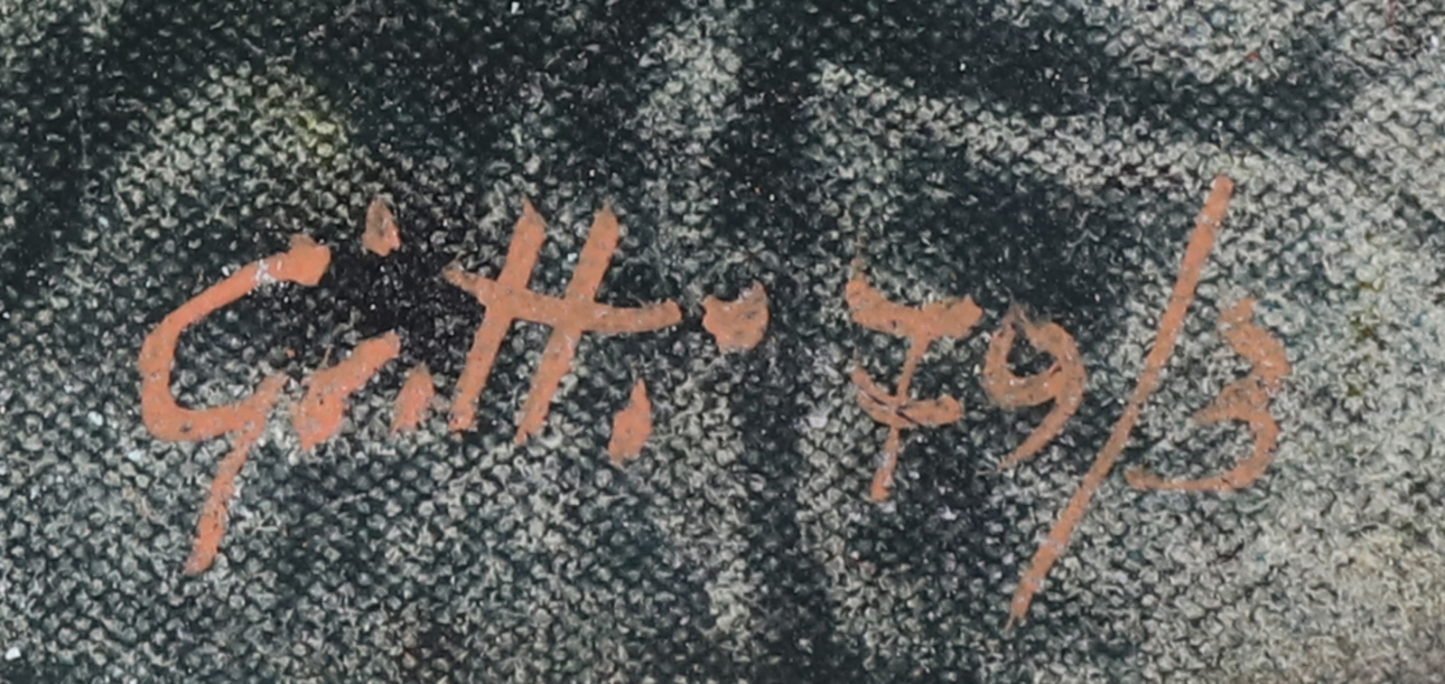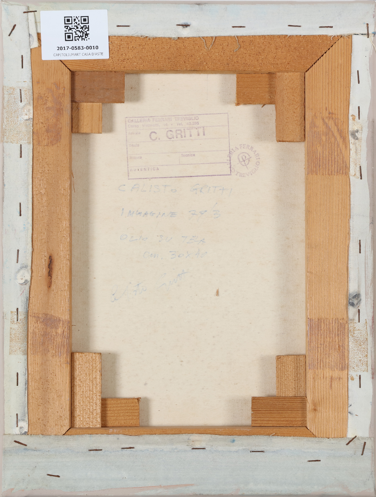 GRITTI CALLISTO (n. 1937) Immagine. 1979. Olio su tela . Cm 30,00 x 40,00. Firma e anno in basso a destra. Al retro titolo, firma, anno e timbro Galleria Ferrari, Treviglio.