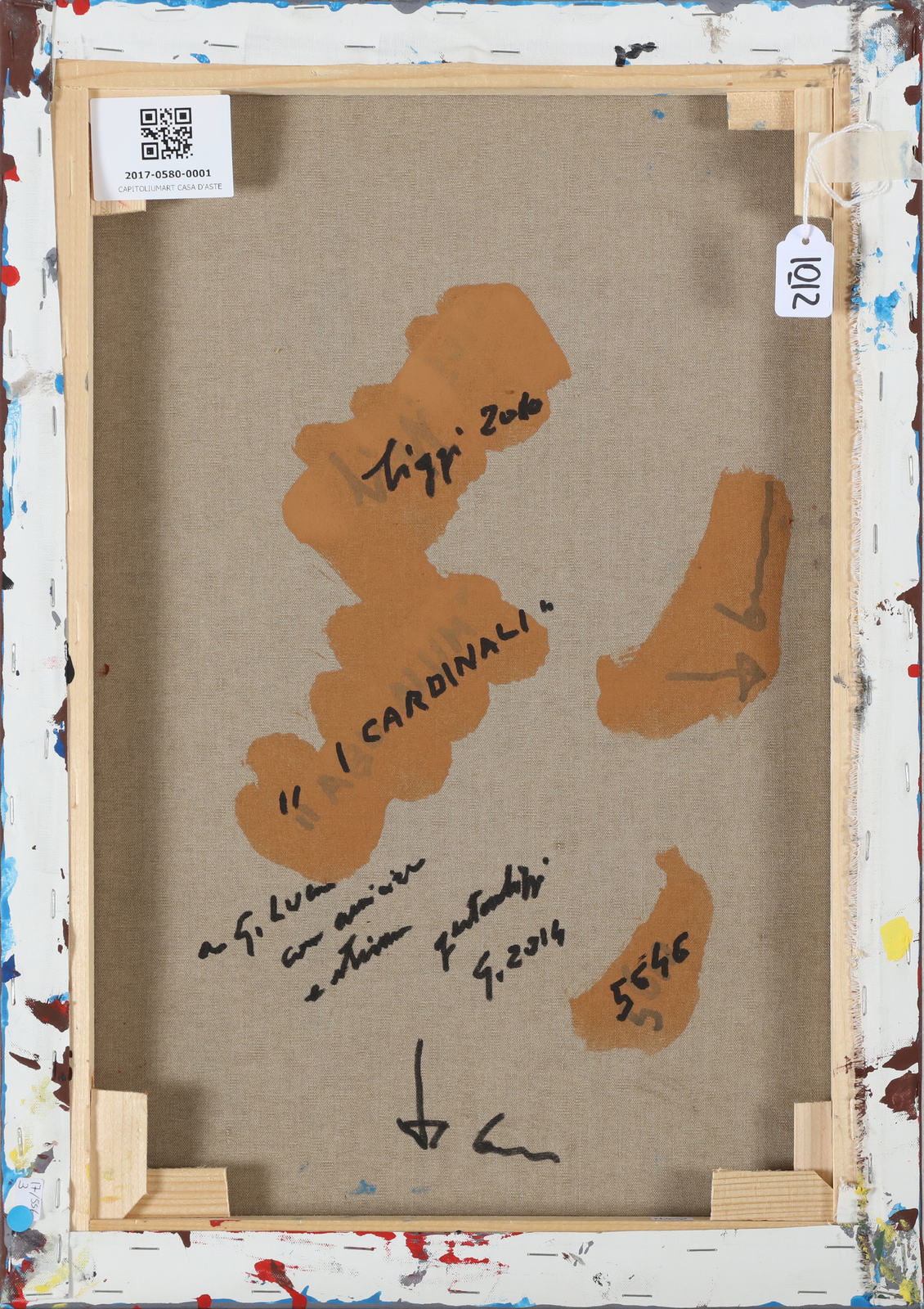 BIGGI GASTONE (1925 - 2014) I Cardinali. 2010. Tecnica mista su tela. Cm 35,00 x 50,00. Al retro firma, titolo, anno e dedica datata 2014. Opera archiviata presso l'Archivio Gastone Biggi, Milano, come da documentazione fotografica allegata all'opera riportante il relativo numero d'inventario.