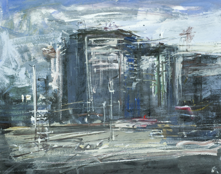 Riccardo Luchini Milano 1949 Periferia Olio su cartone, cm. 38x49 Firmato in basso al centro. Sul verso: firma e titolo.