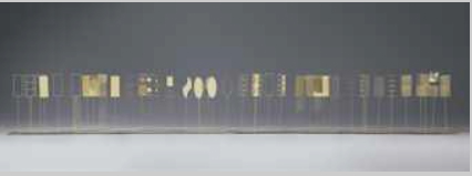 Fausto Melotti (1901-1986) Tema e variazioni I firmato Melotti (su una targhetta circolare); titolo, iscrizione e numerazione TEMA E VARIAZIONE 5-8 1/3 (sulla base di un elemento); titolo, iscrizione e numerazione TEMA E VARIAZIONE 1-4 1/3 (sulla base di un elemento) oro e base in acciaio inox cm 21,5x80x11 (ognuno) cm 21,5x160x11 (totale) (2)Realizzata nel 1970 in 3 esemplari + 1 prova d'artista
