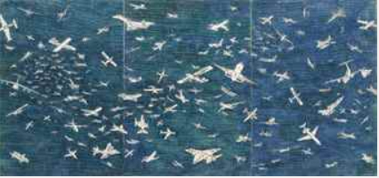 Alighiero Boetti (1940-1994) Aerei biro blu su carta applicata su tela, tre elementi cm 38,2x81 Eseguito nel 1992 Opera registrata presso l'Archivio Alighiero Boetti, Roma, n. 2888, come da autentica su fotografia in data 24 gennaio 2003