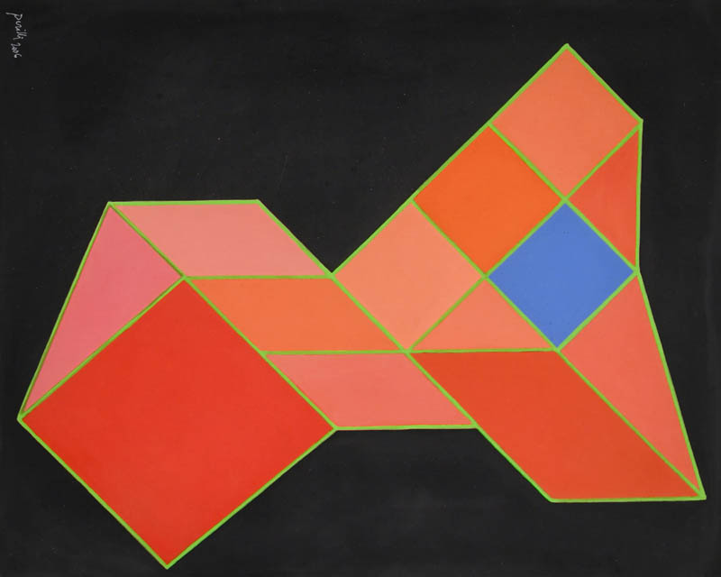 Achille Perilli (Roma 1927 ) Il Ricordo, 2006 Tecnica mista su tela, cm. 40x50. Firma e data in basso a sinistra. Sul verso: firma, data e titolo. Autentica dell'Artista su foto iscritta con il n° 144 dell'anno 2006, nel catalogo generale delle Opere dell'Artista. Foto che ritrae l'Artista con l'opera.