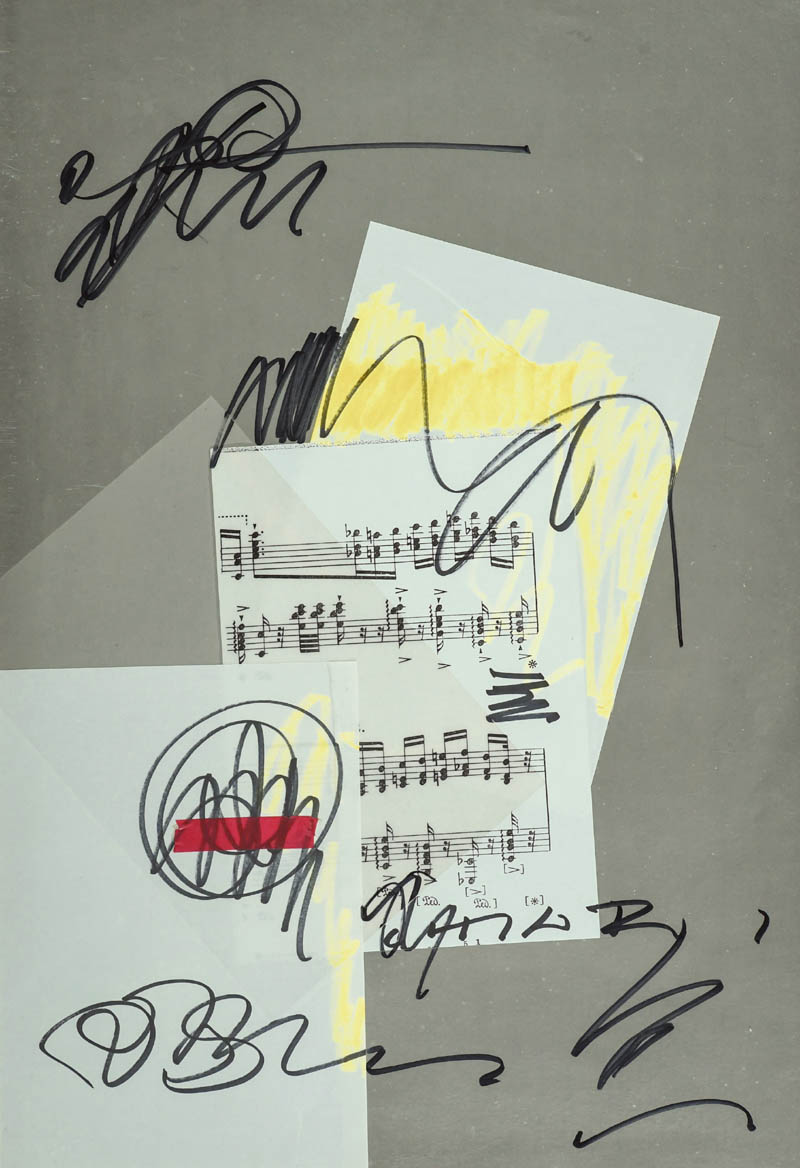 Giuseppe Chiari (Firenze 1926 2007) Spartiti, 2001 Collage e tecnica mista su cartoncino, cm. 70x48. Firmato in basso al centro. Bibliografia: Paolo Fabiani "Giuseppe Chiari", pag. 53. Autentica dell'Artista su foto. Autentica dell'Archivio "Giuseppe e Victoria Chiari" a cura del figlio Mario Chiari, su foto con timbro a secco e Archivio n° 2117.