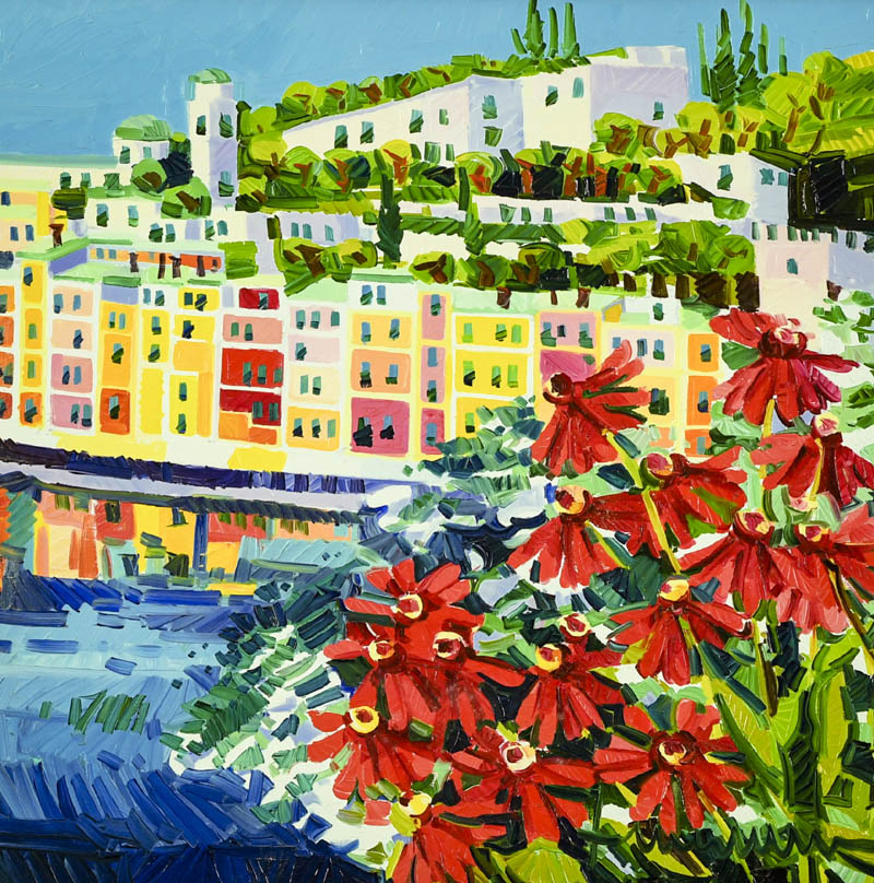 Athos Faccincani (Peschiera del Garda (Vr) 1951 ) Porto Venere e fiori rossi, 2006 Olio su tela , cm. 40x40. Firmato in basso a destra. Sul verso: firma e titolo. Autentica dell'Archivio Faccincani su foto con numero 1319 G e firma dell'Artista.