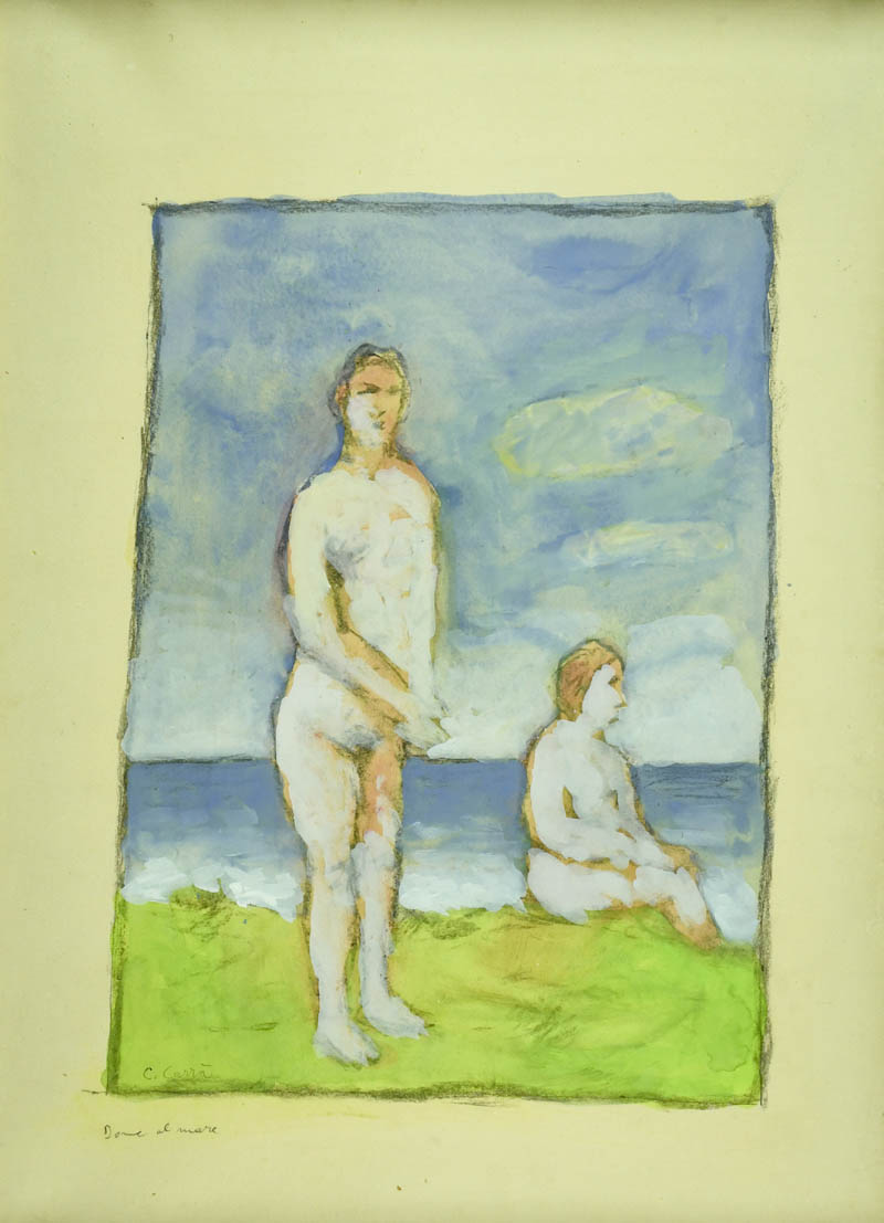 Carlo Carrà (Quargnento (Al) 1881 Milano 1966) Donne al mare, 1942 Acquerello e carboncino su carta riportata su tela, cm. 71x51. Firma e titolo in basso a sinistra. Autentica dell'Archivio Carlo Carrà a cura di Luca Carrà, su foto con Archivio n° 9/42.