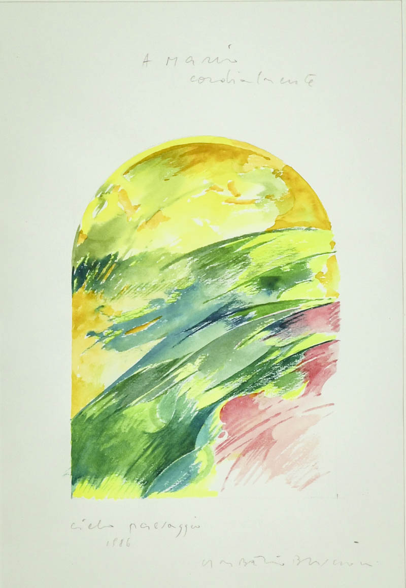 Umberto Buscioni (Bonelle (Pt) 1931 ) Cielo e paesaggio, 1986 Acquerello su cartoncino, cm. 35x24 Firmato in basso a destra, titolo e data in basso a sinistra, dedica a persona in alto al centro.