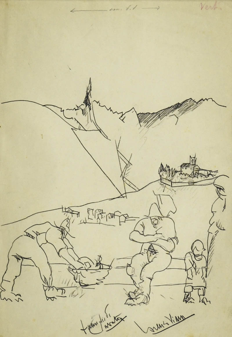 Lorenzo Viani (Viareggio 1882 Ostia 1936) Monte Carchio, 1920 c.a. Matita e lapis su carta, cm. 31,5x22. Firmato in basso a destra. Autentica di Enrico Dei su foto, con timbro a secco.