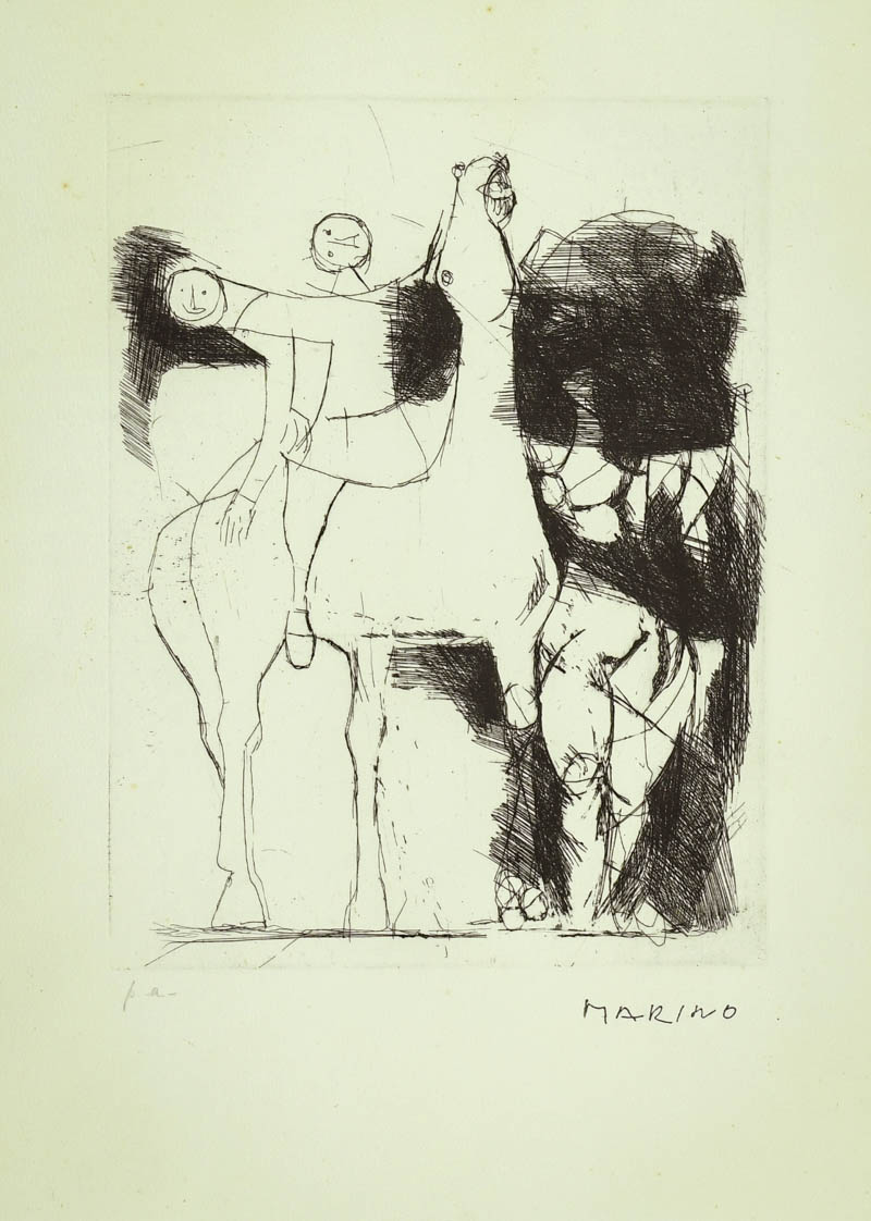 Marino Marini (Pistoia 1901 Viareggio 1980) I giocolieri, 1951 Acquaforte di cm. 33x24,3, su carta a mano Fabriano di cm. 52,8x39, es. P.A Firmato in basso a destra. Sul verso: Scritto di Autenticità della moglie Marina Marini. Bibliografia: Giorgio e Guido Guastalla "Marino Marini - Catalogo ragionato dell'Opera grafica (Incisioni e Litografie) 1919-1980, edizioni Graphis Arte, pag. 40, tav. 202