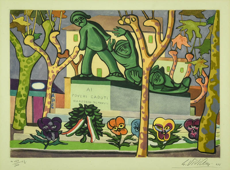 Giuseppe Viviani (Agnano (Pi) 1898 Pisa 1965) Monumento ai caduti di Viareggio, 1956 Acquaforte a colori di cm. 40,8x57,3, su carta di cm. 57x76, es. 169/200 Firma, data e timbro "Tarde Sed Tuto - Giuseppe Viviani" in basso a destra, tiratura in basso a sinistra. Bibliografia: Giuseppe Marino "Giuseppe Viviani - Incisioni & Xilografie - Catalogo Generale", ediz. ArtCenter, pag. 220 e 221.