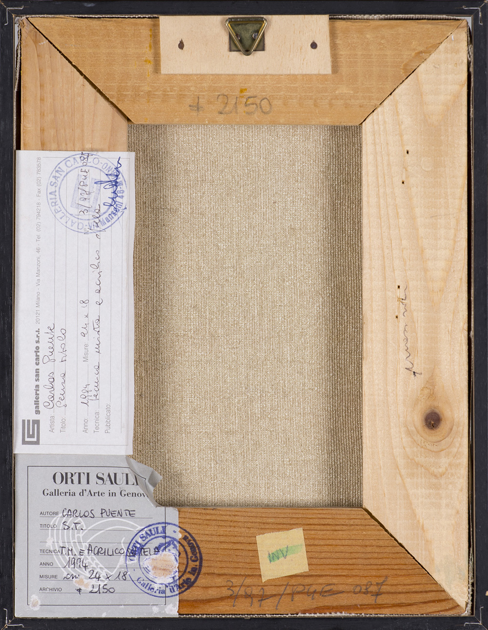 Etichetta e timbro della Galleria d'Arte San Carlo (MI) al retro