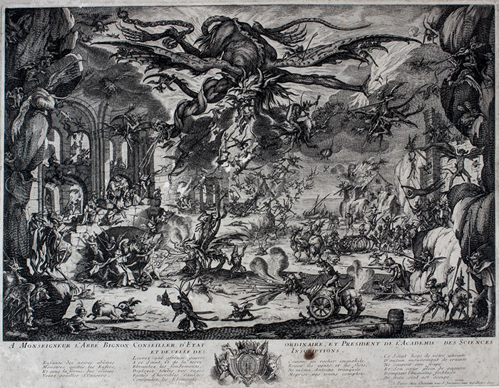Acquaforte. mm 355x460. Foglio: 360x470. Copia in controparte dall'originale di Jacques Callot (Lieure, 1416) non classificata da Lieure. Nel margine in basso si legge la dedica all'abate Jean Paul Bignon (1662-1743), predicatore di Luigi XIV, consigliere di stato, membro de l’Académie Française, presidente de l’Académie des Sciences e segretario de l'Académie des Inscriptions et Médailles. Bella impressione su carta vergellata pesante con filigrana "iscrizione".