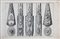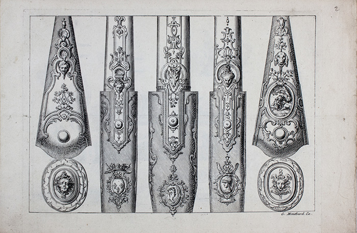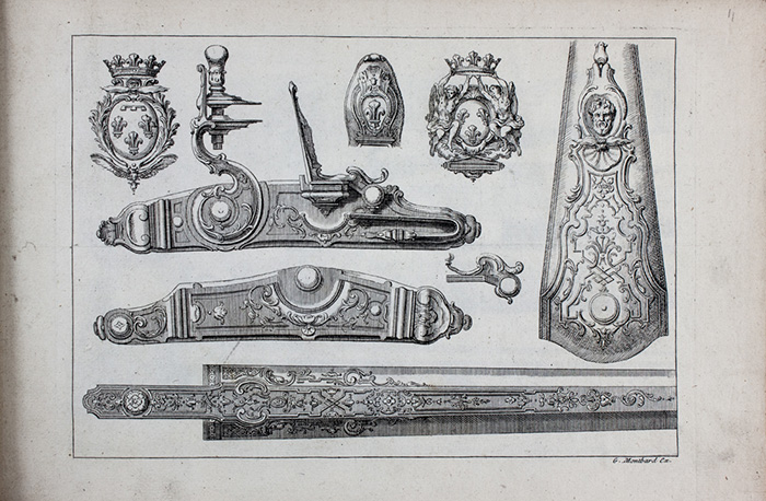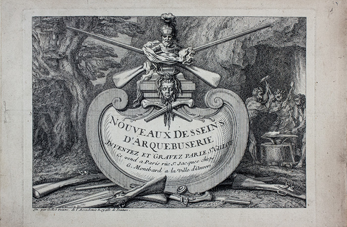 Acquaforte. mm 185x247. Foglio: 200x300. Berlin Katalog, 859 (con indirizzo di F. Chereau, Paris). Pittore ed incisore francese, maestro di Antoine Watteau e Nicolas Lancret, fu fantasioso e bizzarro disegnatore: di lui ci restano diverse serie di modelli decorativi per i più svariati usi (tappezzerie, costumi, cartigli, carrozze…). Serie completa in cinque tavole ed un frontespizio raffigurante elementi metallici decorativi per pistole e fucili, nell'edizione pubblicata presso G. Montbard a la Ville d’Anverse (sono note altre edizioni con indirizzi di Audran e di F. Chereau). L'esecuzione della serie è da collocare tra il 1715 e il 1720, quest'ultima data della morte, anni entro i quali Gillot venne nominato “accademico reale” (come riportato in basso a sinistra sotto l’inciso nel frontespizio). Ottime impressioni su sottile carta vergellata con frammento di filigrana "grappolo d'uva" ai fogli 2 e 6.