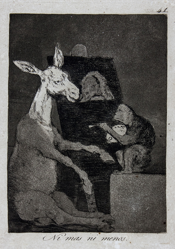 Acquaforte, acquatinta brunita, puntasecca e bulino. mm 200x150. Foglio: 295x205. Harris, 76. Quarantunesima tavola da Los Caprichos con il titolo in basso e il numero in alto a destra . Bellissima prova, con acquatinta dalle tonalità intense, e ben visibili i ritocchi a puntasecca sul naso del somaro, ed i tratti a bulino nel posteriore della scimmia. Edizione non definibile con esattezza, ma certamente fra le prime delle 12 realizzate: secondo Harris le dimensioni del foglio sarebbero compatibili con le prove di stato, dopo la lettera e la numerazione, le caratteristiche di stampa con una delle prime tre edizioni, mentre la carta, sottile e con vergelle corrisponderebbe alla I edizione; la bisellatura della lastra infine compare dalla IV edizione in poi.