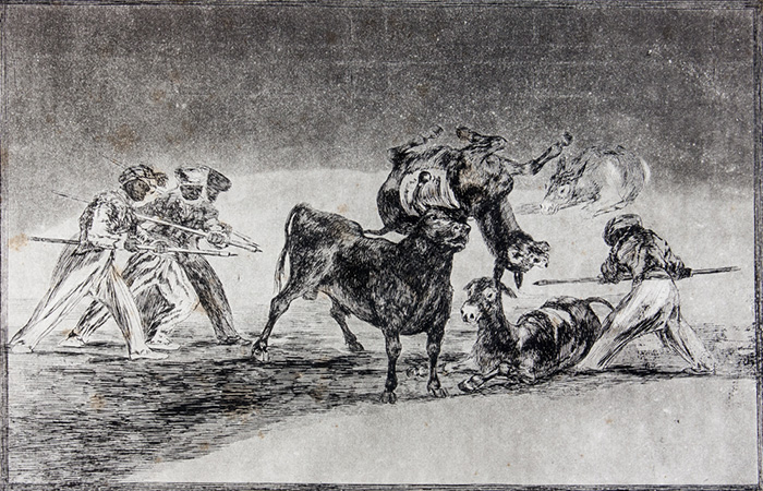 Acquaforte, acquatinta brunita, puntasecca e bulino. mm 245x350. Foglio: 320x445. Harris, 220. Tavola n. 17 da La Tauromaquia, serie pubblicata per la prima volta nel 1816 in 33 fogli. Ottima prova nella II edizione (su sette), stampata su carta pesante non vergellata - con lieve bisellatura della lastra e ossidazione del rame sul lato destro - nella Calcografia per la Real Academia nel 1855.