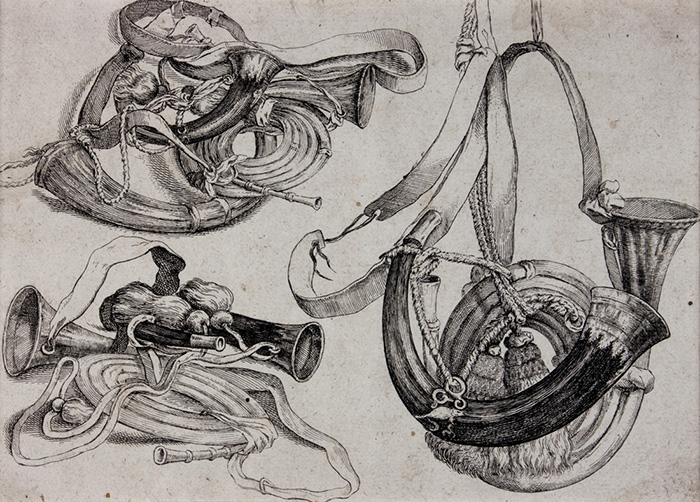 Wenzel Hollar, Sette corni da caccia in tre gruppi.Acquaforte....