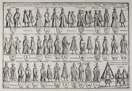 Acquaforte. mm 280x400. Foglio: 320x435. Buscaroli, 83. Varignana, 492. Firmata e datata "1703" in basso a destra. L'incisione, di grande interesse documentario, presenta una sfilata dei rappresentanti di tutte le Arti di Bologna in abiti da cerimonia, numerati ed identificati, con gli stemmi delle corporazioni e il gonfalone processionale. Ottima prova su carta con vergelle filigranata con parte di iscrizione "[...]ZANO" e contromarche "quattro cerchi singoli" su due file, una in alto lungo il margine superiore e l'altra in basso.