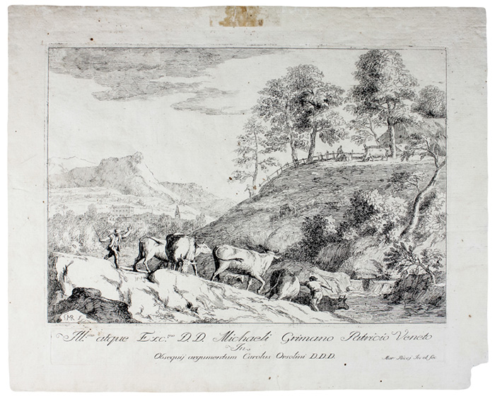 Acquaforte. mm 254x359. Lastra della dedica: mm 30x348. Foglio: mm 345x430. Bartsch, 15. Succi (Da Carlevarijs ai Tiepolo), 427. Bellini (Ricci), 15. Siglata "MR f" nella composizione in basso a sinistra e firmata sulla lastra contenente la dedica a Michele Grimani. Quindicesima tavola dalla serie di venti paesaggi pubblicati a Venezia nel 1730 da Carlo Orsolini. Bellissima prova nel III e definitivo stato - dopo l'aggiunta del numero "15" in alto a sinistra, che nell'esemplare presente risulta abraso - su carta vergellata con filigrana "stemma ovale".
