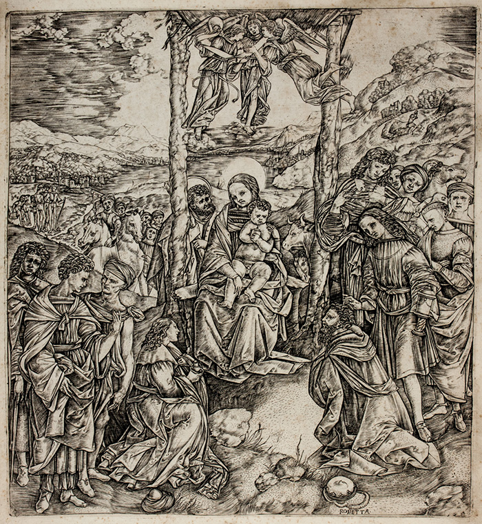 Bulino. mm 302x278. Foglio: 320x293. Hind, 10. TIB 25 (Commentary), . Vallardi (1834), p. 234. Levenson, Oberhüber, Sheehan, 118. Firmata "ROBETTA" in basso a destra. La composizione pare ispirarsi alla pala d'altare compiuta da Filippino Lippi nel 1496 ed oggi agli Uffizi. Bellissima prova di grande freschezza e nitore, in tiratura Vallardi del 1806, su carta vergellata con antica filigrana non identificabile. Nel 1821 (Catalogo dei più celebri intagliatori in legno ed in rame e capiscuola di diverse età e nazioni, Vallardi, Milano 1821, p. 24) il rame era ancora presso Vallardi che si definisce editore di quest'opera, attualmente è conservato al British Museum.