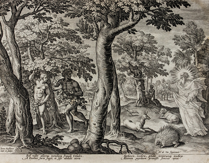 Bulino. mm 198/200x250/255. Due fogli, Dio crea il firmamento e Dio crea i pesci e gli uccelli, da Imago Bonitatis Illius, serie in 7 tavole più frontespizio con dedica a WilhelmV duca di Baviera (Hollstein (Sadeler), 13 e 14). Sette fogli da Boni et mali Scientia, serie in 11 stampe più frontespizio datate 1583 raffiguranti la storia dei primi uomini, e dedicata a Francesco Maria Della Rovere duca di Urbino (Hollstein (Sadeler), 17-20 e 22,24,25). Ottime prove su carta vergellata apparentemente priva di filigrana. (9)