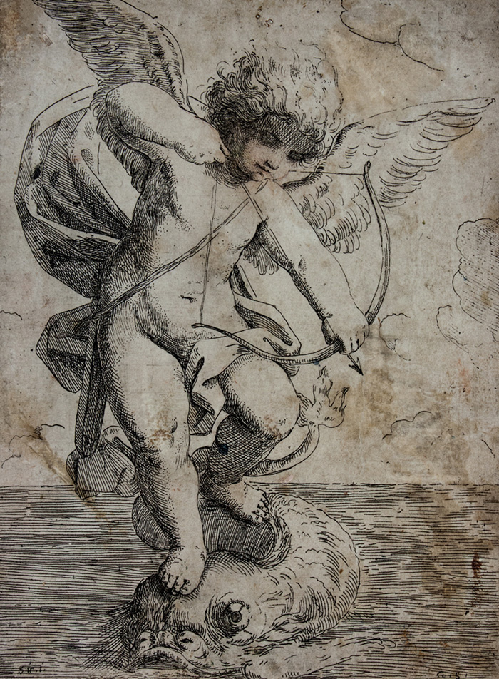 Gerolamo Scarsello, Eros con arco e freccia su un delfino.Acquaforte. mm...
