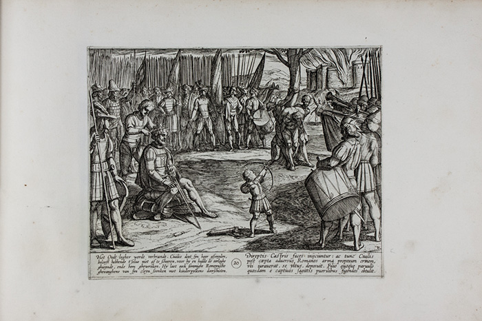 Acquaforte. mm 165x210. Foglio: 245/250x370. Bartsch, 560-595. Serie di 36 tavole, compreso il frontespizio con la firma e la data "1611", rilegate in cartonato, e dedicate alla rivolta batava, che ebbe luogo nella provincia romana della Germania inferiore tra il 69 e il 70 d.C. I Batavi erano una tribù germanica, secondo Tacito appartenente al popolo dei Catti, che viveva negli attuali Paesi Bassi, nell'area del delta del Reno; guidati da Gaio Giulio Civile, riuscirono a distruggere quattro legioni, infliggendo sconfitte umilianti all'esercito romano che però riuscì a sedare la rivolta e a ristabilire l'ordine. Ottime prove tutte su carta vergellata con filigrana "giglio di Strasburgo" o "nome di Gesù".