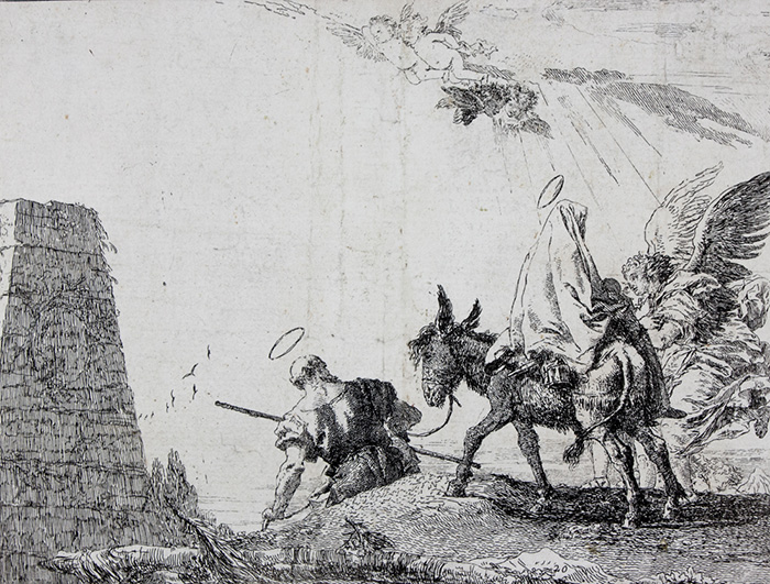 Acquaforte. mm 184x242. De Vesme, 20. Rizzi, 86. In basso verso destra il numero "20". Ventesima tavola da Idee pittoresche sopra la fugga in Egitto di Giesù, Maria e Gioseppe, serie di 27 incisioni pubblicata a Würzburg nel 1753 e dedicata a Carlo Filippo di Grienffenklau, principe arcivescovo di Würzburg. La raccolta delle Idee pittoresche è composta dalla dedica incisa, il frontespizio figurato ed una tavola con titolo, cui seguono 24 tavole che descrivono diversi momenti della fuga in Egitto, di cui tre datate, 1750 (tavola 13), 1752 (tavola 19), 1753 (tavola 21). Le stampe della serie sono note in più stati, generalmente 2 o 3, con distinzione fondamentale costituita dalla numerazione progressiva su ogni tavola. Bella prova nel II stato su 2 dopo la numerazione, su carta vergellata forte priva di filigrana.