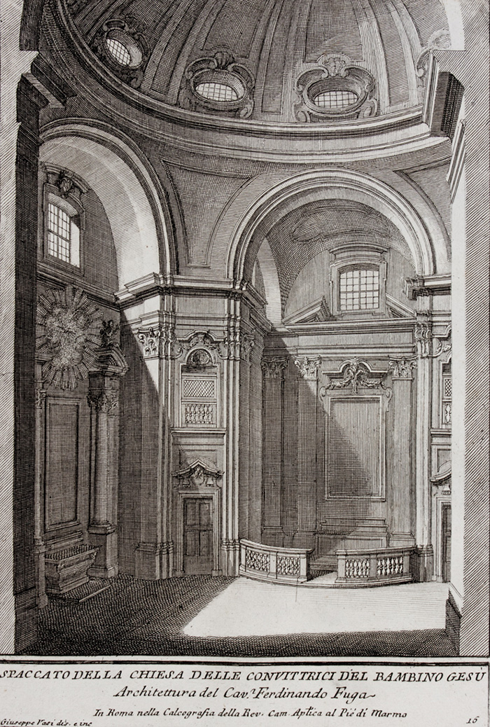 9 tavole di Giuseppe Vasi e 5 tavole di Jean-Laurent Legeay da Raccolta di varie fabbriche  di Rome e altrove... (1739). Acquaforte. mm 190/198x287/290. Foglio: 295x440. Firmate e titolate nel margine inferiore. 3 tavole di Giovanni Battista Falda da Il Nuovo Teatro delle Fabbriche, et Edificii, in Prospettiva di Roma Moderna (...) 1665-69 Edito da Giovan Giacomo De Rossi. (17)