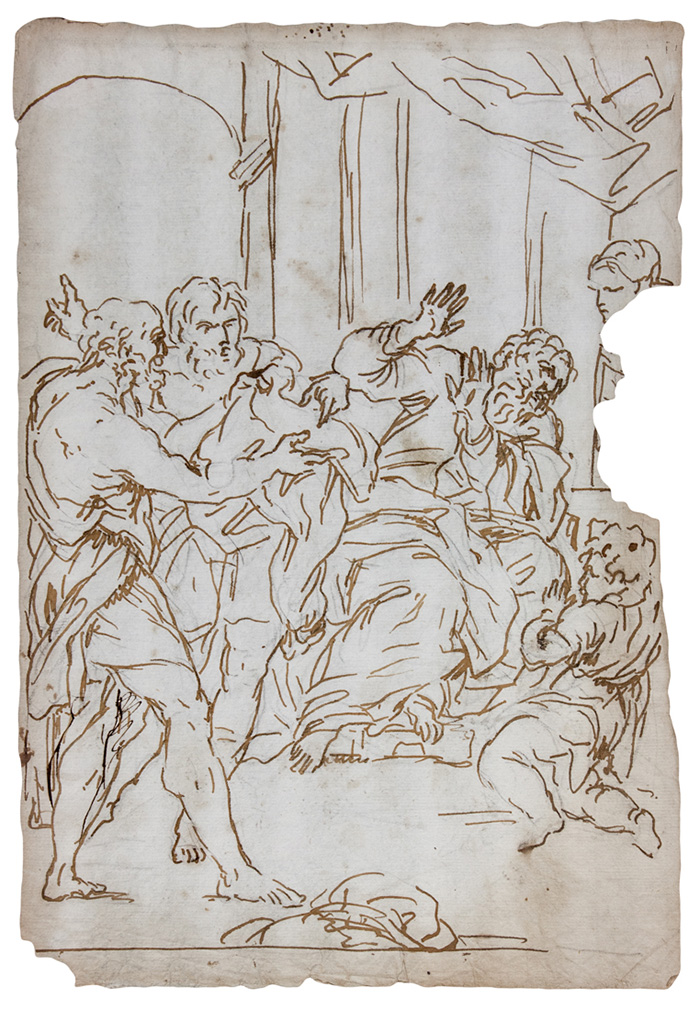 Pennello e inchiostro marrone chiaro e brunosu tratti di matita di grafite. Sottile carta bianca con vergelle ma priva di filigrana. mm 310x215.