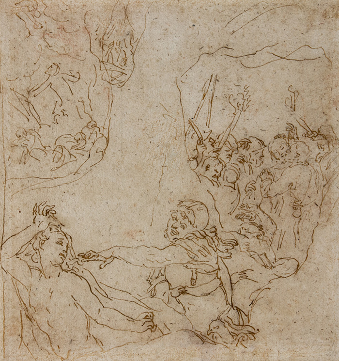 Penna e inchiostro bruno su carta vergellata con parte di filigrana non identificabile. mm 150x142. Il disegno mostra un giovane nudo che fugge inseguito da un soldato mentre alle sue spalle si svolge la cattura di Cristo. Il disegno è tratto da un dipinto perduto del Correggio del quale rimane una copia presso la Galleria Nazionale di Parma, questa facente parte di un gruppo di derivazioni eseguite nell'ambito della sua scuola allo scopo di documentare la produzione del maestro.