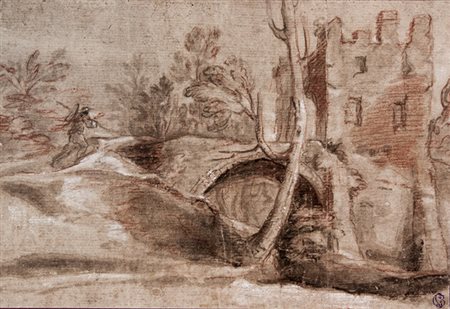 Giovanni Francesco Barbieri (detto il Guercino) [cerchia di], Paesaggio con ponte e castello.