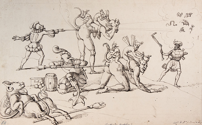 Penna e inchiostro nero su carta vergata veneta con filigrana "tre mezzelune". In basso al centro "Battaglia diabolica" e a sinistra "inv.e di D. Ferdinando Suman" a penna ed inchiostro blu ed inchiostro bruno in antica grafia. mm 253x407. Pittore di nobili origini che nella seconda parte della sua vita prese i voti pur continuando la sua attività artistica: nel 1847 eseguì una serie di tele raffiguranti storie francescane ed antoniane per la Basilica del Santo.